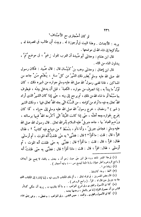 قَالَ ابْنُ إسْحَاقَ: وَحَدَّثَنِي وَهْبُ بْنُ كَيْسَانَ قَالَ: قَالَ عُبَيْدٌ: فَكَانَ رَسُولُ اللَّهِ صَلَّى اللهُ عَلَيْهِ وَسَلَّمَ يُجَاوِرُ ذَلِكَ الشَّهْرَ مِنْ كُلِّ سَنَةٍ، يُطْعِمُ مَنْ جَاءَهُ مِنْ الْمَسَاكِينِ، فَإِذَا قَضَى رَسُولُ اللَّهِ صَلَّى اللهُ عَلَيْهِ وَسَلَّمَ جِوَارَهُ مِنْ شَهْرِهِ ذَلِكَ، كَانَ أَوَّلُ مَا يَبْدَأُ بِهِ، إذَا انْصَرَفَ مِنْ جِوَارِهِ، الْكَعْبَةَ، قَبْلَ أَنْ يَدْخُلَ بَيْتَهُ، فَيَطُوفُ بِهَا سَبْعًا أَوْ مَا شَاءَ اللَّهُ مِنْ ذَلِكَ، ثُمَّ يَرْجِعُ إلَى بَيْتِهِ، حَتَّى إذَا كَانَ الشَّهْرُ الَّذِي أَرَادَ اللَّهُ تَعَالَى بِهِ فِيهِ مَا أَرَادَ مِنْ كَرَامَتِهِ، مِنْ السّنة الَّتِي بَعثه اللَّهُ تَعَالَى فِيهَا، وَذَلِكَ الشَّهْرُ (شَهْرُ) [2] رَمَضَانَ، خَرَجَ رَسُولُ اللَّهِ صَلَّى اللهُ عَلَيْهِ وَسَلَّمَ إلَى حِرَاءٍ، كَمَا كَانَ يَخْرُجُ لِجِوَارِهِ وَمَعَهُ أَهْلُهُ، حَتَّى إذَا كَانَتْ اللَّيْلَةُ الَّتِي أَكْرَمَهُ اللَّهُ فِيهَا بِرِسَالَتِهِ، وَرَحِمَ الْعِبَادَ بِهَا، جَاءَهُ جِبْرِيلُ عَلَيْهِ السَّلَامُ بِأَمْرِ اللَّهِ تَعَالَى. قَالَ رَسُولُ اللَّهِ صَلَّى اللهُ عَلَيْهِ وَسَلَّمَ: فَجَاءَنِي جِبْرِيلُ، وَأَنَا نَائِمٌ، بِنَمَطٍ [3] مِنْ دِيبَاجٍ فِيهِ كِتَابٌ [4] ، فَقَالَ اقْرَأْ، قَالَ: قُلْتُ: مَا أَقْرَأُ [5] ؟ قَالَ: فَغَتَّنِي [6] بِهِ حَتَّى ظَنَنْتُ أَنَّهُ الْمَوْتُ، ثُمَّ أَرْسَلَنِي فَقَالَ: اقْرَأْ، قَالَ: قُلْتُ: مَا أَقْرَأُ؟ قَالَ: فَغَتَّنِي بِهِ حَتَّى ظَنَنْتُ أَنَّهُ الْمَوْتُ، ثُمَّ أَرْسَلَنِي، فَقَالَ: اقْرَأْ، قَالَ: قُلْتُ: مَاذَا أَقْرَأُ؟ قَالَ: فَغَتَّنِي بِهِ حَتَّى ظَنَنْتُ أَنَّهُ