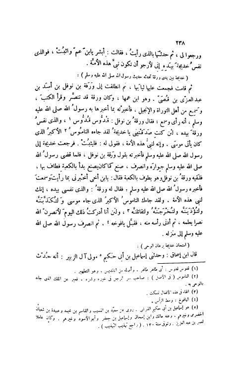 ثُمَّ قَامَتْ فَجَمَعَتْ عَلَيْهَا ثِيَابَهَا، ثُمَّ انْطَلَقَتْ إلَى وَرَقَةَ بْنِ نَوْفَلِ بْنِ أَسَدِ بْنِ عَبْدِ الْعُزَّى بْنِ قُصَيٍّ، وَهُوَ ابْنُ عَمِّهَا، وَكَانَ وَرَقَةُ قَدْ تَنَصَّرَ وَقَرَأَ الْكُتُبَ، وَسَمِعَ مِنْ أَهْلِ التَّوْرَاةِ وَالْإِنْجِيلِ، فَأَخْبَرْتُهُ بِمَا أَخْبَرَهَا بِهِ رَسُولُ اللَّهِ صَلَّى اللهُ عَلَيْهِ وَسَلَّمَ، أَنَّهُ رَأَى وَسَمِعَ، فَقَالَ وَرَقَةُ بْنُ نَوْفَلٍ: قُدُّوسٌ قُدُّوسٌ [1] ، وَاَلَّذِي نَفْسُ وَرَقَةَ بِيَدِهِ، لَئِنْ كُنْتِ صَدَّقْتِينِي يَا خَدِيجَةُ لَقَدْ جَاءَهُ النَّامُوسُ [2] الْأَكْبَرُ الَّذِي كَانَ يَأْتِي مُوسَى، وَإِنَّهُ لَنَبِيُّ هَذِهِ الْأُمَّةِ، فَقُولِي لَهُ: فَلْيَثْبُتْ. فَرَجَعَتْ خَدِيجَةُ إلَى رَسُولِ اللَّهِ صَلَّى اللهُ عَلَيْهِ وَسَلَّمَ فَأَخْبَرْتُهُ بِقَوْلِ وَرَقَةَ بْنِ نَوْفَلٍ، فَلَمَّا قَضَى رَسُولُ اللَّهِ صَلَّى اللهُ عَلَيْهِ وَسَلَّمَ جِوَارَهُ وَانْصَرَفَ، صَنَعَ كَمَا كَانَ يَصْنَعُ بَدَأَ بِالْكَعْبَةِ فَطَافَ بِهَا، فَلَقِيَهُ وَرَقَةُ بْنُ نَوْفَلٍ وَهُوَ يَطُوفُ بِالْكَعْبَةِ فَقَالَ: يَا بن أَخِي أَخْبِرْنِي بِمَا رَأَيْتَ وَسَمِعْتَ فَأَخْبَرَهُ رَسُولُ اللَّهِ صَلَّى اللهُ عَلَيْهِ وَسَلَّمَ، فَقَالَ لَهُ وَرَقَةُ: وَاَلَّذِي نَفْسِي بِيَدِهِ، إنَّكَ لَنَبِيُّ هَذِهِ الْأُمَّةِ، وَلَقَدْ جَاءَكَ النَّامُوسُ الْأَكْبَرُ الَّذِي جَاءَ مُوسَى وَلَتُكَذَّبَنَّهُ وَلَتُؤْذَيَنَّهُ وَلَتُخْرَجَنَّهُ وَلَتُقَاتَلَنَّهُ [3] ، وَلَئِنْ أَنَا أَدْرَكْتُ ذَلِكَ الْيَوْمَ لَأَنْصُرَنَّ اللَّهَ نَصْرًا يَعْلَمُهُ، ثُمَّ أَدْنَى رَأْسَهُ مِنْهُ، فَقَبَّلَ يَافُوخَهُ [4] ، ثُمَّ انْصَرَفَ رَسُولُ اللَّهِ صَلَّى اللهُ عَلَيْهِ وَسَلَّمَ إلَى مَنْزِلِهِ.