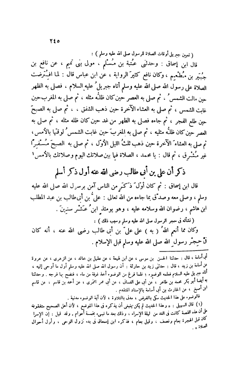 قَالَ ابْنُ إسْحَاقَ: وَحَدَّثَنِي عُتْبَةُ بْنُ مُسْلِمٍ، مَوْلَى بَنِي تَمِيمٍ، عَنْ نَافِعِ بْنِ جُبَيْرِ بْنِ مُطْعِمٍ، وَكَانَ نَافِعُ كَثِيرَ الرِّوَايَةِ، عَنْ ابْنِ عَبَّاسٍ قَالَ: لَمَّا اُفْتُرِضَتْ الصَّلَاةُ عَلَى رَسُولِ اللَّهِ صَلَّى اللهُ عَلَيْهِ وَسَلَّمَ أَتَاهُ جِبْرِيلُ عَلَيْهِ السَّلَامُ، فَصَلَّى بِهِ الظُّهْرَ حِينَ مَالَتْ الشَّمْسُ، ثُمَّ صَلَّى بِهِ الْعَصْرَ حِينَ كَانَ ظِلُّهُ مِثْلَهُ، ثُمَّ صَلَّى بِهِ الْمَغْرِبَ حِينَ غَابَتِ الشَّمْسُ، ثُمَّ صَلَّى بِهِ الْعِشَاءَ الْآخِرَةَ حِينَ ذَهَبَ الشَّفَقُ، ثُمَّ صَلَّى بِهِ الصُّبْحَ حِينَ طَلَعَ الْفَجْرُ، ثُمَّ جَاءَهُ فَصَلَّى بِهِ الظُّهْرَ مِنْ غَدٍ حِينَ كَانَ ظِلُّهُ مِثْلَهُ، ثُمَّ صَلَّى بِهِ الْعَصْرَ حِينَ كَانَ ظِلُّهُ مِثْلِيَّهُ، ثُمَّ صَلَّى بِهِ الْمَغْرِبَ حِينَ غَابَتْ الشَّمْسُ لِوَقْتِهَا بِالْأَمْسِ، ثُمَّ صَلَّى بِهِ الْعِشَاءَ الْآخِرَةَ حِينَ ذَهَبَ ثُلُثُ اللَّيْلِ الْأَوَّلُ، ثُمَّ صَلَّى بِهِ الصُّبْحَ مُسْفِرًا غَيْرَ مُشْرِقٍ، ثُمَّ قَالَ: يَا مُحَمَّدُ، الصَّلَاةُ فِيمَا بَيْنَ صَلَاتِكَ الْيَوْمَ وَصَلَاتِكَ بِالْأَمْسِ [1]