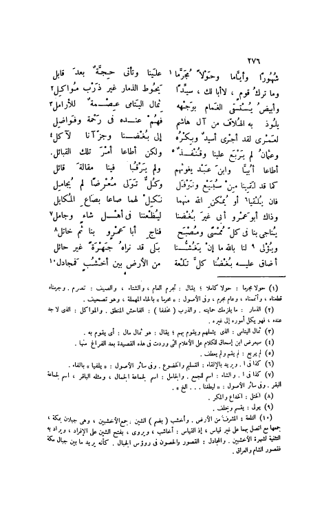 [10] التلعة: المشرف من الأَرْض. وأخشب (بِضَم) الشين. جمع الأخشبين، وَهِي جبلان بِمَكَّة، جمعهَا مَعَ اتَّصل بهما على غير قِيَاس، إِذْ الْقيَاس: أخاشب، ويروى، بِفَتْح الشين على الْإِفْرَاد، وَيُرَاد بِهِ التَّثْنِيَة لشهرة الأخشبين. والمجادل: الْقُصُور والحصون فِي رُءُوس الْجبَال. كَأَنَّهُ يُرِيد مَا بَين جبال مَكَّة فقصور الشَّام وَالْعراق.