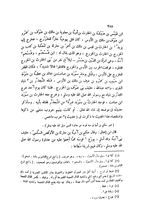 ابْن قَيْسِ بْنِ هَيْشَةَ بْنِ الْحَارِثِ بْنِ أُمَيَّةَ بْنِ مُعَاوِيَةَ بْنِ مَالِكِ بْنِ عَوْفِ بْنِ عَمْرِو ابْن عَوْفِ بْنِ مَالِكِ بْنِ الْأَوْسِ، كَانَ قَتَلَ يَهُودِيَّا جَارًا لِلْخَزْرَجِ، فَخَرَجَ إلَيْهِ يَزِيدُ [1] بْنُ الْحَارِثِ بْنِ قَيْسِ بْنِ مَالِكِ بْنِ أَحْمَرَ بْنِ حَارِثَةَ بْنِ ثَعْلَبَةَ بْنِ كَعْبِ بْنِ الْخَزْرَجِ بْنِ الْحَارِثِ بْنِ الْخَزْرَجِ- وَهُوَ الَّذِي يُقَالُ لَهُ: ابْنُ فُسْحُمٍ، وَفُسْحُمٌ [2] أُمُّهُ، وَهِيَ امْرَأَةٌ مِنْ الْقَيْنِ بْنِ جَسْرٍ- لَيْلًا فِي نَفَرٍ مِنْ بَنِي الْحَارِثِ بْنِ الْخَزْرَجِ فَقَتَلُوهُ، فَوَقَعَتْ الْحَرْبُ بَيْنَ الْأَوْسِ وَالْخَزْرَجِ فَاقْتَتَلُوا قِتَالًا شَدِيدًا، فَكَانَ الظَّفَرُ لِلْخَزْرَجِ عَلَى الْأَوْسِ، وَقُتِلَ يَوْمئِذٍ سُوَيْدُ بْنُ صَامِتِ بْنِ خَالِدِ بْنِ عَطِيَّةَ بْنِ حَوْطِ ابْن حَبِيبِ بْنِ عَمْرِو بْنِ عَوْفِ بْنِ مَالِكِ بْنِ الْأَوْسِ، قَتَلَهُ الْمُجَذَّرُ بْنُ [3] ذِيَادٍ الْبَلَوِيُّ، وَاسْمُهُ عَبْدُ اللَّهِ، حَلِيفُ بَنِي عَوْفِ بْنِ الْخَزْرَجِ. فَلَمَّا كَانَ يَوْمُ أُحُدٍ خَرَجَ الْمُجَذَّرُ بْنُ ذِيَادٍ مَعَ رَسُولِ اللَّهِ صَلَّى اللهُ عَلَيْهِ وَسَلَّمَ، وَخَرَجَ مَعَهُ الْحَارِثُ بْنُ سُوَيْدِ ابْن صَامِتٍ، فَوَجَدَ الْحَارِثَ بْنَ سُوَيْدٍ غِرَّةً [4] مِنْ الْمُجَذَّرِ فَقَتَلَهُ بِأَبِيهِ. وَسَأَذْكُرُ حَدِيثَهُ فِي مَوْضِعِهِ إنْ شَاءَ اللَّهُ تَعَالَى. ثُمَّ كَانَتْ بَيْنَهُمْ حُرُوبٌ مَنَعَنِي مِنْ ذِكْرِهَا وَاسْتِقْصَاءِ هَذَا الْحَدِيثِ مَا ذَكَرْتُ فِي (حَدِيثِ) [5] حَرْبِ دَاحِسٍ.