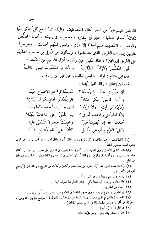 اللَّهُ تَعَالَى عَلَيْهِمْ طَيْرًا مِنْ الْبَحْرِ أَمْثَالَ الْخَطَاطِيفِ وَالْبَلَسَانِ [1] ، مَعَ كُلِّ طَائِرٍ مِنْهَا ثَلَاثَةُ أَحْجَارٍ يَحْمِلُهَا: حَجَرٌ فِي مِنْقَارِهِ، وَحَجَرَانِ فِي رِجْلَيْهِ، أَمْثَالُ الْحِمَّصِ وَالْعَدَسِ، لَا تُصِيبُ مِنْهُمْ أَحَدًا إلَّا هَلَكَ، وَلَيْسَ كُلُّهُمْ أَصَابَتْ. وَخَرَجُوا هَارِبِينَ يَبْتَدِرُونَ الطَّرِيقَ الَّذِي مِنْهُ جَاءُوا، وَيَسْأَلُونَ عَنْ نُفَيْلِ بْنِ حَبِيبٍ لِيَدُلّهُمْ عَلَى الطَّرِيقِ إلَى الْيَمَنِ [2] ، فَقَالَ نُفَيْلٌ حِينَ رَأَى مَا أَنْزَلَ اللَّهُ بِهِمْ مِنْ نِقْمَتِهِ: