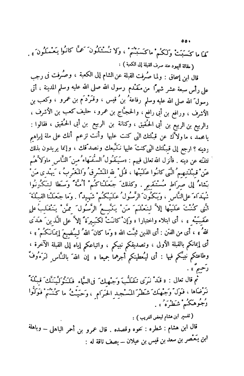 يَا مُحَمَّدُ، مَا وَلَّاكَ عَنْ قِبْلَتِكَ الَّتِي كُنْتَ عَلَيْهَا وَأَنْتَ تَزْعُمُ أَنَّكَ عَلَى مِلَّةِ إبْرَاهِيمَ وَدِينِهِ؟ ارْجِعْ إلَى قِبْلَتِكَ الَّتِي كُنْتَ عَلَيْهَا نَتَّبِعْكَ وَنُصَدِّقْكَ، وَإِنَّمَا يُرِيدُونَ بِذَلِكَ فِتْنَتَهُ عَنْ دِينِهِ. فَأَنْزَلَ اللَّهُ تَعَالَى فِيهِمْ: سَيَقُولُ السُّفَهاءُ مِنَ النَّاسِ مَا وَلَّاهُمْ عَنْ قِبْلَتِهِمُ الَّتِي كانُوا عَلَيْها، قُلْ لِلَّهِ الْمَشْرِقُ وَالْمَغْرِبُ، يَهْدِي مَنْ يَشاءُ إِلى صِراطٍ مُسْتَقِيمٍ. وَكَذلِكَ جَعَلْناكُمْ أُمَّةً وَسَطاً لِتَكُونُوا شُهَداءَ عَلَى النَّاسِ، وَيَكُونَ الرَّسُولُ عَلَيْكُمْ شَهِيداً. وَما جَعَلْنَا الْقِبْلَةَ الَّتِي كُنْتَ عَلَيْها إِلَّا لِنَعْلَمَ مَنْ يَتَّبِعُ الرَّسُولَ مِمَّنْ يَنْقَلِبُ عَلى عَقِبَيْهِ 2: 142- 143، أَيْ ابْتِلَاءً وَاخْتِبَارًا وَإِنْ كانَتْ لَكَبِيرَةً إِلَّا عَلَى الَّذِينَ هَدَى اللَّهُ 2: 143، أَيْ مِنْ الْفِتَنِ: أَيْ الَّذِينَ ثَبَّتَ اللَّهُ وَما كانَ اللَّهُ لِيُضِيعَ إِيمانَكُمْ 2: 143، أَيْ إيمَانَكُمْ بِالْقِبْلَةِ الْأُولَى، وَتَصْدِيقَكُمْ نَبِيَّكُمْ، وَاتِّبَاعَكُمْ إيَّاهُ إلَى الْقِبْلَةِ الْآخِرَةِ، وَطَاعَتَكُمْ نَبِيَّكُمْ فِيهَا: أَيْ لَيُعْطِيَنَّكُمْ أَجْرَهُمَا جَمِيعًا إِنَّ الله بِالنَّاسِ لَرَؤُفٌ رَحِيمٌ 2: 143.