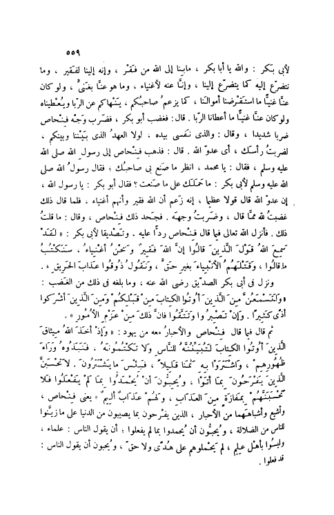 لِأَبِي بَكْرٍ: وَاَللَّهِ يَا أَبَا بَكْرٍ، مَا بِنَا إلَى اللَّهِ مِنْ فَقْرٍ، وَإِنَّهُ إلَيْنَا لَفَقِيرٌ، وَمَا نَتَضَرَّعُ إلَيْهِ كَمَا يَتَضَرَّعُ إلَيْنَا، وَإِنَّا عَنْهُ لَأَغْنِيَاءُ، وَمَا هُوَ عَنَّا بِغَنِيٍّ، وَلَوْ كَانَ عَنَّا غَنِيًّا مَا اسْتَقْرَضَنَا أَمْوَالَنَا، كَمَا يَزْعُمُ صَاحِبُكُمْ، يَنْهَاكُمْ عَنْ الرِّبَا وَيُعْطِينَاهُ وَلَوْ كَانَ عَنَّا غَنِيًّا مَا أَعْطَانَا الرِّبَا. قَالَ: فَغَضِبَ أَبُو بَكْرٍ، فَضَرَبَ وَجْهَ فِنْحَاصَ ضَرْبًا شَدِيدًا، وَقَالَ: وَاَلَّذِي نَفْسِي بِيَدِهِ، لَوْلَا الْعَهْدُ الَّذِي بَيْنَنَا وَبَيْنَكُمْ، لَضَرَبْتُ رَأْسَكَ، أَيْ عَدُوَّ اللَّهِ. قَالَ: فَذَهَبَ فِنْحَاصُ إلَى رَسُولِ اللَّهِ صَلَّى اللهُ عَلَيْهِ وَسَلَّمَ، فَقَالَ: يَا مُحَمَّدُ، اُنْظُرْ مَا صَنَعَ بِي صَاحِبُكَ، فَقَالَ رَسُولُ اللَّهِ صَلَّى اللهُ عَلَيْهِ وَسَلَّمَ لِأَبِي بَكْرٍ: مَا حَمَلَكَ عَلَى مَا صَنَعْتَ؟ فَقَالَ أَبُو بَكْرٍ: يَا رَسُولَ اللَّهِ، إنَّ عَدُوَّ اللَّهِ قَالَ قَوْلًا عَظِيمًا، إنَّهُ زَعَمَ أَنَّ اللَّهَ فَقِيرٌ وَأَنَّهُمْ أَغْنِيَاءُ، فَلَمَّا قَالَ ذَلِكَ غَضِبْتُ للَّه مِمَّا قَالَ، وَضَرَبْتُ وَجْهَهُ. فَجَحَدَ ذَلِكَ فِنْحَاصُ، وَقَالَ: مَا قُلْتُ ذَلِكَ. فَأَنْزَلَ اللَّهُ تَعَالَى فِيمَا قَالَ فِنْحَاصُ رَدًّا عَلَيْهِ، وَتَصْدِيقًا لِأَبِي بَكْرٍ: لَقَدْ سَمِعَ اللَّهُ قَوْلَ الَّذِينَ قالُوا إِنَّ اللَّهَ فَقِيرٌ وَنَحْنُ أَغْنِياءُ، سَنَكْتُبُ مَا قالُوا، وَقَتْلَهُمُ الْأَنْبِياءَ بِغَيْرِ حَقٍّ، وَنَقُولُ ذُوقُوا عَذابَ الْحَرِيقِ 3: 181.