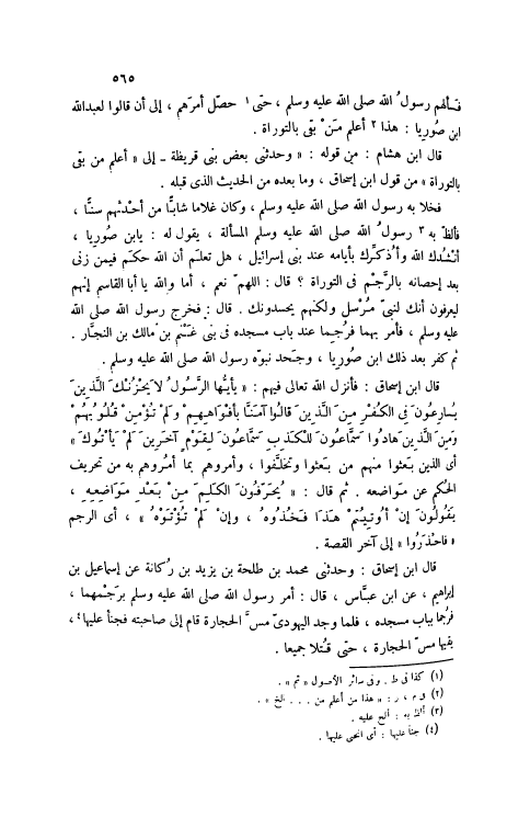 فَخَلَا بِهِ رَسُولُ اللَّهِ صَلَّى اللهُ عَلَيْهِ وَسَلَّمَ، وَكَانَ غُلَامًا شَابًّا مِنْ أَحْدَثِهِمْ سِنًّا، فَأَلَظَّ بِهِ [3] رَسُولُ اللَّهِ صَلَّى اللهُ عَلَيْهِ وَسَلَّمَ الْمَسْأَلَةَ، يَقُولُ لَهُ: يَا بن صُورِيَّا، أَنْشُدُكَ اللَّهَ وَأُذَكِّرُكَ بِأَيَّامِهِ عِنْدَ بَنِي إسْرَائِيلَ، هَلْ تَعْلَمُ أَنَّ اللَّهَ حَكَمَ فِيمَنْ زَنَى بَعْدَ إحْصَانِهِ بِالرَّجْمِ فِي التَّوْرَاةِ؟ قَالَ: اللَّهمّ نَعَمْ، أَمَا وَاَللَّهِ يَا أَبَا الْقَاسِمِ إنَّهُمْ لَيَعْرِفُونَ أَنَّكَ لَنَبِيٌّ مُرْسَلٌ وَلَكِنَّهُمْ يَحْسُدُونَكَ. قَالَ: فَخَرَجَ رَسُولُ اللَّهِ صَلَّى اللهُ عَلَيْهِ وَسَلَّمَ، فَأَمَرَ بِهِمَا فَرُجِمَا عِنْدَ بَابِ مَسْجِدِهِ فِي بَنِي غَنْمِ بْنِ مَالِكِ بْنِ النَّجَّارِ.