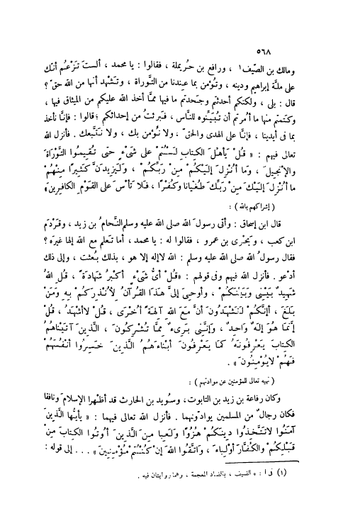 وَمَالِكُ بْنُ الصَّيْفِ [1] ، وَرَافِعُ بْنُ حُرَيْمِلَةَ، فَقَالُوا: يَا مُحَمَّدُ، أَلَسْتَ تَزْعُمُ أَنَّكَ عَلَى مِلَّةِ إبْرَاهِيمَ وَدِينِهِ، وَتُؤْمِنُ بِمَا عِنْدَنَا مِنْ التَّوْرَاةِ، وَتَشْهَدُ أَنَّهَا مِنْ اللَّهِ حَقٌّ؟