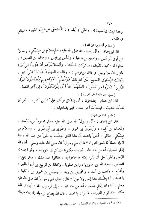 قَالَ ابْنُ إسْحَاقَ: وَأَتَى رَسُولَ اللَّهِ صَلَّى اللهُ عَلَيْهِ وَسَلَّمَ سَلَامُ بْنُ مِشْكَمٍ، وَنُعْمَانُ ابْن أَوْفَى أَبُو أَنَسٍ، وَمَحْمُودُ بْنُ دِحْيَةَ، وَشَأْسُ بْنُ قَيْسٍ، وَمَالِكُ بْنُ الصَّيْفِ [1] ، فَقَالُوا لَهُ: كَيْفَ نَتَّبِعُكَ وَقَدْ تَرَكْتَ قِبْلَتَنَا، وَأَنْتَ لَا تَزْعُمُ أَنَّ عُزَيْرًا ابْنُ اللَّهِ؟
