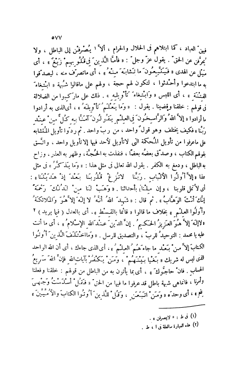 فِيهِنَّ الْعِبَادَ، كَمَا ابْتَلَاهُمْ فِي الْحَلَالِ وَالْحَرَامِ، أَلَّا [1] يُصْرَفْنَ إلَى الْبَاطِلِ، وَلَا يُحَرَّفْنَ عَنْ الْحَقِّ. يَقُولُ عَزَّ وَجَلَّ: فَأَمَّا الَّذِينَ فِي قُلُوبِهِمْ زَيْغٌ 3: 7، أَيْ مَيْلٌ عَنْ الْهُدَى فَيَتَّبِعُونَ مَا تَشابَهَ مِنْهُ 3: 7، أَيْ مَا تَصَرَّفَ مِنْهُ، لِيُصَدِّقُوا بِهِ مَا ابْتَدَعُوا وَأَحْدَثُوا، لِتَكُونَ لَهُمْ حُجَّةٌ، وَلَهُمْ عَلَى مَا قَالُوا شُبْهَةَ ابْتِغاءَ الْفِتْنَةِ 3: 7، أَيْ اللَّبْسِ وَابْتِغاءَ تَأْوِيلِهِ 3: 7. ذَلِكَ عَلَى مَا رَكِبُوا مِنْ الضَّلَالَةِ فِي قَوْلِهِمْ: خَلَقْنَا وَقَضَيْنَا. يَقُولُ: وَما يَعْلَمُ تَأْوِيلَهُ 3: 7، أَيْ الَّذِي بِهِ أَرَادُوا مَا أَرَادُوا إِلَّا اللَّهُ وَالرَّاسِخُونَ فِي الْعِلْمِ يَقُولُونَ آمَنَّا بِهِ كُلٌّ مِنْ عِنْدِ رَبِّنا 3: 7 فَكَيْفَ يَخْتَلِفُ وَهُوَ قَوْلٌ وَاحِدٌ، مِنْ رَبٍّ وَاحِدٍ. ثُمَّ رَدُّوا تَأْوِيلَ الْمُتَشَابِهِ عَلَى مَا عَرَفُوا مِنْ تَأْوِيلِ الْمُحَكِّمَةِ الَّتِي لَا تَأْوِيلَ لِأَحَدٍ فِيهَا إلَّا تَأْوِيلٌ وَاحِدٌ، وَاتَّسَقَ بِقَوْلِهِمْ الْكِتَابُ، وَصَدَّقَ بَعْضُهُ بَعْضًا، فَنَفَذَتْ بِهِ الْحُجَّةُ، وَظَهَرَ بِهِ الْعُذْرُ، وَزَاحَ بِهِ الْبَاطِلَ، وَدَمَغَ بِهِ الْكُفْرَ. يَقُولُ اللَّهُ تَعَالَى فِي مِثْلِ هَذَا: وَما يَذَّكَّرُ 2: 269 فِي مِثْلِ هَذَا إِلَّا أُولُوا الْأَلْبابِ. رَبَّنا لَا تُزِغْ قُلُوبَنا بَعْدَ إِذْ هَدَيْتَنا 3: 7- 8: