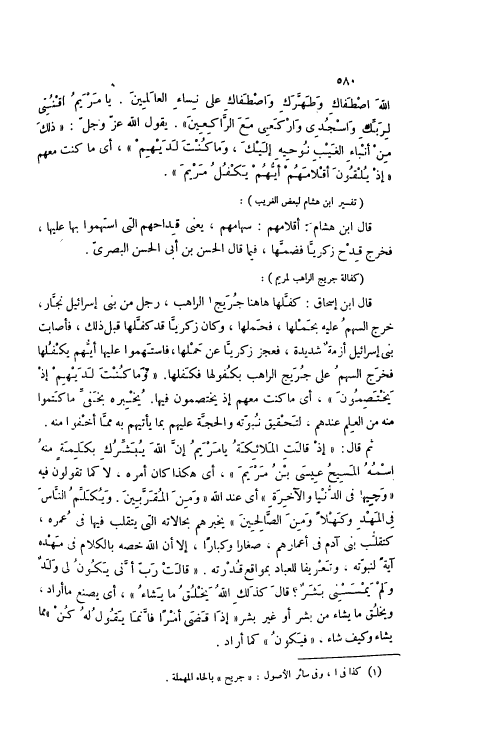 قَالَ ابْنُ إسْحَاقَ: كَفَّلَهَا هَاهُنَا جُرَيْجٌ [1] الرَّاهِبُ، رَجُلٌ مِنْ بَنِي إسْرَائِيلَ نَجَّارٌ، خَرَجَ السَّهْمُ عَلَيْهِ بِحَمْلِهَا، فَحَمَلَهَا، وَكَانَ زَكَرِيَّا قَدْ كَفَّلَهَا قَبْلَ ذَلِكَ، فَأَصَابَتْ بَنِي إسْرَائِيلَ أَزْمَةٌ شَدِيدَةٌ، فَعَجَزَ زَكَرِيَّا عَنْ حَمْلِهَا، فَاسْتَهَمُوا عَلَيْهَا أَيُّهُمْ يَكْفُلُهَا فَخَرَجَ السَّهْمُ عَلَى جُرَيْجٍ الرَّاهِبِ بِكُفُولِهَا فَكَفَلَهَا. وَما كُنْتَ لَدَيْهِمْ إِذْ يَخْتَصِمُونَ 3: 44، أَيْ مَا كُنْتَ مَعَهُمْ إذْ يَخْتَصِمُونَ فِيهَا. يُخْبِرُهُ بِخَفِيِّ مَا كَتَمُوا مِنْهُ مِنْ الْعِلْمِ عِنْدَهُمْ، لِتَحْقِيقِ نُبُوَّتِهِ وَالْحُجَّةِ عَلَيْهِمْ بِمَا يَأْتِيهِمْ بِهِ مِمَّا أَخْفَوْا مِنْهُ.