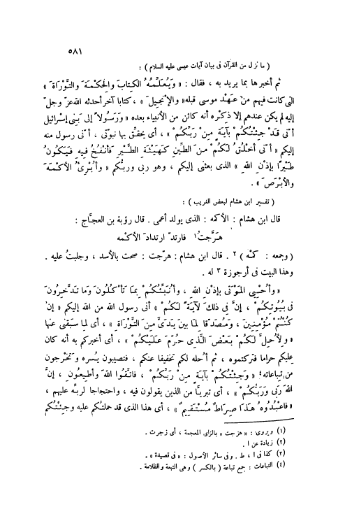 وَأُحْيِ الْمَوْتى بِإِذْنِ اللَّهِ، وَأُنَبِّئُكُمْ بِما تَأْكُلُونَ وَما تَدَّخِرُونَ فِي بُيُوتِكُمْ، إِنَّ فِي ذلِكَ لَآيَةً لَكُمْ 3: 49 أَنِّي رَسُولُ اللَّهِ مِنْ اللَّهِ إلَيْكُمْ إِنْ كُنْتُمْ مُؤْمِنِينَ، وَمُصَدِّقاً لِما بَيْنَ يَدَيَّ مِنَ التَّوْراةِ 3: 49- 50، أَيْ لِمَا سَبَقَنِي عَنْهَا وَلِأُحِلَّ لَكُمْ بَعْضَ الَّذِي حُرِّمَ عَلَيْكُمْ 3: 50، أَيْ أُخْبِرُكُمْ بِهِ أَنَّهُ كَانَ عَلَيْكُمْ حَرَامًا فَتَرَكْتُمُوهُ، ثُمَّ أُحِلُّهُ لَكُمْ تَخْفِيفًا عَنْكُمْ، فَتُصِيبُونَ يُسْرَهُ وَتَخْرُجُونَ مِنْ تِبَاعَاتِهِ [4] وَجِئْتُكُمْ بِآيَةٍ مِنْ رَبِّكُمْ، فَاتَّقُوا اللَّهَ وَأَطِيعُونِ، إِنَّ اللَّهَ رَبِّي وَرَبُّكُمْ 3: 50- 51، أَيْ تبريًّا مِنْ الَّذِينَ يَقُولُونَ فِيهِ، وَاحْتِجَاجًا لِرَبِّهِ عَلَيْهِمْ، فَاعْبُدُوهُ هَذَا صِراطٌ مُسْتَقِيمٌ 3: 51، أَيْ هَذَا الَّذِي قَدْ حَمَلْتُكُمْ عَلَيْهِ وَجِئْتُكُمْ