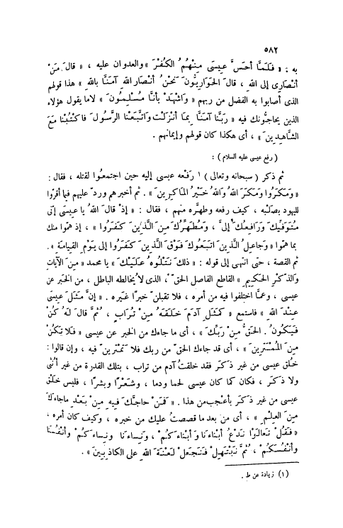 ثُمَّ الْقِصَّةُ، حَتَّى انْتَهَى إلَى قَوْلِهِ: ذلِكَ نَتْلُوهُ عَلَيْكَ 3: 58 يَا مُحَمَّدُ مِنَ الْآياتِ وَالذِّكْرِ الْحَكِيمِ 3: 58 الْقَاطِعِ الْفَاصِلِ الْحَقِّ، الَّذِي لَا يُخَالِطُهُ الْبَاطِلُ، مِنْ الْخَبَرِ عَنْ عِيسَى، وَعَمَّا اخْتَلَفُوا فِيهِ مِنْ أَمْرِهِ، فَلَا تَقْبَلَنَّ خَبَرًا غَيْرَهُ. إِنَّ مَثَلَ عِيسى عِنْدَ اللَّهِ 3: 59 فَاسْتَمِعْ كَمَثَلِ آدَمَ خَلَقَهُ مِنْ تُرابٍ، ثُمَّ قَالَ لَهُ كُنْ فَيَكُونُ. الْحَقُّ مِنْ رَبِّكَ 3: 59- 60، أَيْ مَا جَاءَكَ مِنْ الْخَبَرِ عَنْ عِيسَى فَلا تَكُنْ مِنَ الْمُمْتَرِينَ 3: 60، أَيْ قَدْ جَاءَكَ الْحَقُّ مِنْ رَبِّكَ فَلَا تَمْتَرِيَنَّ فِيهِ، وَإِنْ قَالُوا: