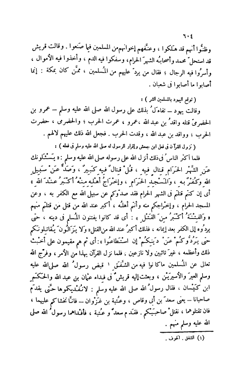 فَلَمَّا أَكْثَرَ النَّاسُ فِي ذَلِكَ أَنْزَلَ اللَّهُ على رَسُوله صَلَّى اللهُ عَلَيْهِ وَسَلَّمَ: يَسْئَلُونَكَ عَنِ الشَّهْرِ الْحَرامِ قِتالٍ فِيهِ، قُلْ قِتالٌ فِيهِ كَبِيرٌ، وَصَدٌّ عَنْ سَبِيلِ اللَّهِ وَكُفْرٌ بِهِ، وَالْمَسْجِدِ الْحَرامِ، وَإِخْراجُ أَهْلِهِ مِنْهُ أَكْبَرُ عِنْدَ اللَّهِ 2: 217 أَيْ إنْ كُنْتُمْ قَتَلْتُمْ فِي الشَّهْرِ الْحَرَامِ فَقَدْ صَدُّوكُمْ عَنْ سَبِيلِ اللَّهِ مَعَ الْكُفْرِ بِهِ، وَعَنْ الْمَسْجِدِ الْحَرَامِ، وَإِخْرَاجُكُمْ مِنْهُ وَأَنْتُمْ أَهْلُهُ، أَكْبَرُ عِنْدَ اللَّهِ مِنْ قَتْلِ مَنْ قَتَلْتُمْ مِنْهُمْ وَالْفِتْنَةُ أَكْبَرُ مِنَ الْقَتْلِ 2: 217: أَيْ قَدْ كَانُوا يَفْتِنُونَ الْمُسْلِمَ فِي دِينِهِ، حَتَّى يَرُدُّوهُ إلَى الْكُفْرِ بَعْدَ إيمَانِهِ، فَذَلِكَ أَكْبَرُ عِنْدَ اللَّهِ مِنْ الْقَتْلِ وَلا يَزالُونَ يُقاتِلُونَكُمْ حَتَّى يَرُدُّوكُمْ عَنْ دِينِكُمْ إِنِ اسْتَطاعُوا 2: 217: أَيْ ثُمَّ هُمْ مُقِيمُونَ عَلَى أَخْبَثِ ذَلِكَ وَأَعْظَمِهِ، غَيْرَ تَائِبِينَ وَلَا نَازِعِينَ. فَلَمَّا نَزَلَ الْقُرْآنُ بِهَذَا مِنْ الْأَمْرِ، وَفَرَّجَ اللَّهُ تَعَالَى عَنْ الْمُسْلِمِينَ مَا كَانُوا فِيهِ مِنْ الشَّفَقِ [1] قَبَضَ رَسُولُ اللَّهِ صَلَّى اللهُ عَلَيْهِ وَسَلَّمَ الْعِيرَ وَالْأَسِيرَيْنِ، وَبَعَثَتْ إلَيْهِ قُرَيْشٌ فِي فِدَاءِ عُثْمَانَ بْنِ عَبْدِ اللَّهِ وَالْحَكَمِ ابْنِ كَيْسَانَ، فَقَالَ رَسُولُ اللَّهِ صَلَّى اللهُ عَلَيْهِ وَسَلَّمَ: لَا نُفْدِيكُمُوهَا حَتَّى يَقْدَمَ صَاحِبَانَا- يَعْنِي سَعْدَ بْنَ أَبِي وَقَّاصٍ، وَعُتْبَةَ بْنَ غَزْوَانَ- فَإِنَّا نَخْشَاكُمْ عَلَيْهِمَا، فَإِنْ تَقْتُلُوهُمَا، نَقْتُلْ صَاحِبَيْكُمْ. فَقَدِمَ سَعْدٌ وَعُتْبَةُ، فَأُفْدَاهُمَا رَسُولُ اللَّهِ صَلَّى اللهُ عَلَيْهِ وَسَلَّمَ مِنْهُمْ.