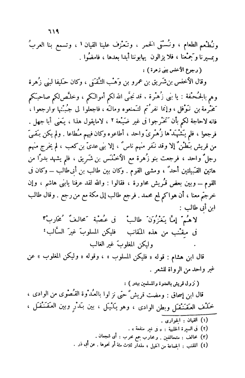 فَرَجَعُوا، فَلَمْ يَشْهَدْهَا زُهْرِيٌّ وَاحِدٌ، أَطَاعُوهُ وَكَانَ فِيهِمْ مُطَاعًا. وَلَمْ يَكُنْ بَقِيَ مِنْ قُرَيْشٍ بَطْنٌ إلَّا وَقَدْ نَفَرَ مِنْهُمْ نَاسٌ، إلَّا بَنِي عَدِيِّ بْنِ كَعْبٍ، لَمْ يَخْرُجْ مِنْهُمْ رَجُلٌ وَاحِدٌ، فَرَجَعَتْ بَنُو زُهْرَةَ مَعَ الْأَخْنَسِ بْنِ شَرِيقٍ، فَلَمْ يَشْهَدْ بَدْرًا مِنْ هَاتَيْنِ الْقَبِيلَتَيْنِ أَحَدٌ، وَمَشَى الْقَوْمُ. وَكَانَ بَيْنَ طَالِبِ بْنِ أَبِي طَالِبٍ- وَكَانَ فِي الْقَوْمِ- وَبَيْنَ بَعْضِ قُرَيْشٍ مُحَاوَرَةٌ، فَقَالُوا: وَاَللَّهِ لَقَدْ عَرَفْنَا يَا بَنِي هَاشِمٍ، وَإِنْ خَرَجْتُمْ مَعَنَا، أَنَّ هَوَاكُمْ لَمَعَ مُحَمَّدٍ. فَرَجَعَ طَالِبٌ إلَى مَكَّةَ مَعَ مَنْ رَجَعَ. وَقَالَ طَالِبُ ابْنُ أَبِي طَالِبٍ: