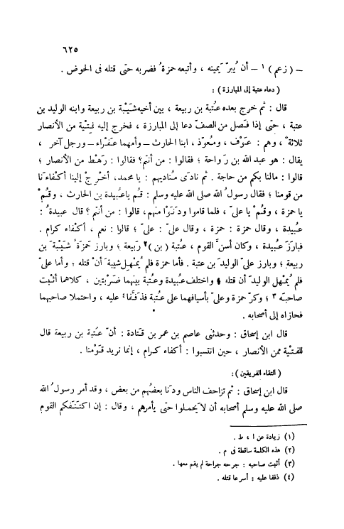 عُبَيْدَةُ، وَقَالَ حَمْزَةُ: حَمْزَةُ، وَقَالَ عَلِيٌّ: عَلِيٌّ، قَالُوا: نَعَمْ، أَكْفَاءٌ كِرَامٌ. فَبَارَزَ عُبَيْدَةُ، وَكَانَ أَسَنَّ الْقَوْمِ، عُتْبَةَ (بْنَ) [2] رَبِيعَةَ، وَبَارَزَ حَمْزَةُ شَيْبَةَ بْنَ رَبِيعَةَ، وَبَارَزَ عَلِيٌّ الْوَلِيدَ بْنَ عُتْبَةَ. فَأَمَّا حَمْزَةُ فَلَمْ يُمْهِلْ شَيْبَةَ أَنْ قَتَلَهُ، وَأَمَّا عَلِيٌّ فَلَمْ يُمْهِلْ الْوَلِيدَ أَنْ قَتَلَهُ، وَاخْتَلَفَ عُبَيْدَةُ وَعُتْبَةُ بَيْنَهُمَا ضَرْبَتَيْنِ، كِلَاهُمَا أَثْبَتَ صَاحِبَهُ [3] ، وَكَرَّ حَمْزَةُ وَعَلِيٌّ بِأَسْيَافِهِمَا عَلَى عُتْبَةَ فَذَفَّفَا [4] عَلَيْهِ، وَاحْتَمَلَا صَاحِبَهُمَا فَحَازَاهُ إلَى أَصْحَابِهِ.