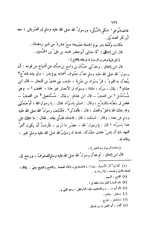 قَالَ ابْنُ إسْحَاقَ: وَحَدَّثَنِي حِبَّانُ بْنُ وَاسِعِ بْنِ حِبَّانَ عَنْ أَشْيَاخٍ مِنْ قَوْمِهِ: أَنَّ رَسُولَ اللَّهِ صَلَّى اللهُ عَلَيْهِ وَسَلَّمَ عَدَّلَ صُفُوفَ أَصْحَابِهِ يَوْمَ بَدْرٍ، وَفِي يَدِهِ قِدْحٌ [2] يُعَدِّلُ بِهِ الْقَوْمَ، فَمَرَّ بِسَوَادِ بْنِ غَزِيَّةَ، حَلِيفِ بَنِي عَدِيِّ بْنِ النَّجَّارِ- قَالَ ابْنُ هِشَامٍ [3] : يُقَالُ، سَوَّادٌ، مُثَقَّلَةٌ، وَسَوَادٌ فِي الْأَنْصَارِ غَيْرُ هَذَا، مُخَفَّفٌ [4]- وَهُوَ مُسْتَنْتِلٌ [5] مِنْ الصَّفِّ- قَالَ ابْنُ هِشَامٍ: وَيُقَالُ: مُسْتَنْصِلٌ [6] مِنْ الصَّفِّ- فَطُعِنَ فِي بَطْنِهِ بِالْقِدْحِ، وَقَالَ: اسْتَوِ يَا سَوَّادُ فَقَالَ: يَا رَسُولَ اللَّهِ، أَوْجَعْتنِي وَقَدْ بَعَثَكَ اللَّهُ بِالْحَقِّ وَالْعَدْلِ، قَالَ: فَأَقِدْنِي [7] . فَكَشَفَ رَسُولُ اللَّهِ صَلَّى اللهُ عَلَيْهِ وَسَلَّمَ عَنْ بَطْنِهِ، وَقَالَ: اسْتَقِدْ، قَالَ: فَاعْتَنَقَهُ فَقَبَّلَ بَطْنَهُ: فَقَالَ: مَا حَمَلَكَ عَلَى هَذَا يَا سَوَّادُ؟ قَالَ: يَا رَسُولَ اللَّهِ، حَضَرَ مَا تَرَى، فَأَرَدْتُ أَنْ يَكُونَ آخِرُ الْعَهْدِ بِكَ أَنْ يَمَسَّ جِلْدِي جِلْدَكَ. فَدَعَا لَهُ رَسُولُ اللَّهِ صَلَّى اللهُ عَلَيْهِ وَسَلَّمَ بِخَيْرِ، وَقَالَهُ لَهُ.
