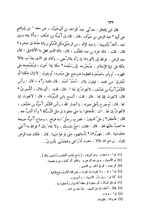 قَالَ: قُلْتُ: ذَاكَ حَمْزَةُ بْنُ عَبْدِ الْمُطَّلِبِ، قَالَ: ذَاكَ الَّذِي فَعَلَ بِنَا الْأَفَاعِيلَ، قَالَ عبد الرَّحْمَن: فو الله إنِّي لَأَقُودُهُمَا إذْ رَآهُ بِلَالٌ مِعَى- وَكَانَ هُوَ الَّذِي يُعَذِّبُ بِلَالًا بِمَكَّةَ عَلَى تَرْكِ الْإِسْلَامِ، فَيُخْرِجُهُ إلَى رَمْضَاءَ [3] مَكَّةَ إذَا حَمَيْتُ، فَيُضْجِعُهُ عَلَى ظَهْرِهِ، ثُمَّ يَأْمُرُ بِالصَّخْرَةِ الْعَظِيمَةِ فَتُوضَعُ عَلَى صَدْرِهِ، ثُمَّ يَقُولُ: لَا تَزَالُ هَكَذَا أَوْ تُفَارِقَ دِينَ مُحَمَّدٍ، فَيَقُولُ بِلَالٌ: أَحَدٌ أَحَدٌ. قَالَ: فَلَمَّا رَآهُ، قَالَ: رَأْسُ الْكُفْرِ أُمَيَّةُ بْنُ خَلَفٍ، لَا نَجَوْتُ إنْ نَجَا [4] . قَالَ: قُلْتُ: أَيْ بِلَالٌ، أَبِأَسِيرَيَّ. [5] قَالَ: لَا نَجَوْتُ إنْ نَجَا. قَالَ: قُلْتُ: أَتَسْمَعُ يَا بن السَّوْدَاءِ، قَالَ: لَا نَجَوْتُ إنْ نَجَا. قَالَ: ثُمَّ صَرَخَ بِأَعْلَى صَوْتِهِ: يَا أَنْصَارَ اللَّهِ، رَأْسُ الْكُفْرِ أُمَيَّةُ بْنُ خَلَفٍ، لَا نَجَوْتُ إنْ نَجَا. قَالَ: فَأَحَاطُوا بِنَا حَتَّى جَعَلُونَا فِي مِثْلِ الْمُسْكَةِ [6] وَأَنَا أَذُبُّ عَنْهُ.