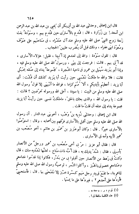 قَالَ ابْنُ إسْحَاقَ: وَحَدَّثَنِي عَبْدُ اللَّهِ بْنُ أَبِي بَكْرٍ أَنَّ يَحْيَى بْنَ عَبْدِ اللَّهِ بْنِ عَبْدِ الرَّحْمَنِ ابْنِ أَسَعْدَ [1] بْنِ زُرَارَةَ، قَالَ: قُدِمَ بِالْأُسَارَى حِينَ قُدِمَ بِهِمْ، وَسَوْدَةُ بِنْتُ زَمَعَةَ زَوْجُ النَّبِيِّ صَلَّى اللهُ عَلَيْهِ وَسَلَّمَ عِنْدَ آلِ عَفْرَاءَ، فِي مَنَاحَتِهِمْ عَلَى عَوْفٍ وَمُعَوِّذٍ ابْنَيْ عَفْرَاءَ، وَذَلِكَ قَبْلَ أَنْ يُضْرَبَ عَلَيْهِنَّ الْحِجَابُ.