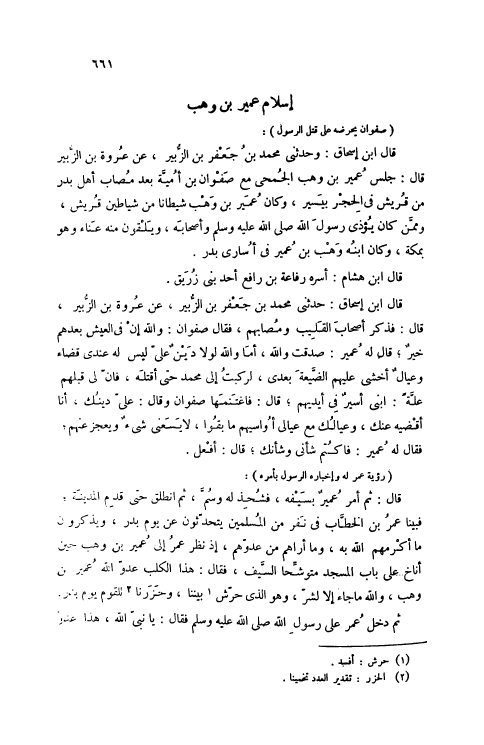 قَالَ ابْنُ إسْحَاقَ: وَحَدَّثَنِي مُحَمَّدُ بْنُ جَعْفَرِ بْنِ الزُّبَيْرِ، عَنْ عُرْوَةَ بْنِ الزُّبَيْرِ قَالَ: جَلَسَ عُمَيْرُ بْنُ وَهْبٍ الْجُمَحِيُّ مَعَ صَفْوَانَ بْنِ أُمَيَّةَ بَعْدَ مُصَابِ أَهْلِ بَدْرٍ مِنْ قُرَيْشٍ فِي الْحِجْرِ بِيَسِيرٍ، وَكَانَ عُمَيْرُ بْنُ وَهْبٍ شَيْطَانًا مِنْ شَيَاطِينِ قُرَيْشٍ، وَمِمَّنْ كَانَ يُؤْذِي رَسُولَ اللَّهِ صَلَّى اللهُ عَلَيْهِ وَسَلَّمَ وَأَصْحَابَهُ، وَيَلْقَوْنَ مِنْهُ عَنَاءً وَهُوَ بِمَكَّةَ، وَكَانَ ابْنُهُ وَهْبُ بْنُ عُمَيْرٍ فِي أُسَارَى بَدْرٍ.