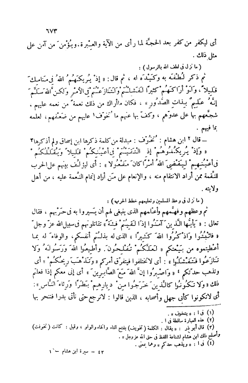 - قَالَ [2] ابْنُ هِشَامٍ: تُخُوِّفَ: مُبَدَّلَةٌ مِنْ كَلِمَةٍ ذَكَرَهَا ابْنُ إسْحَاقَ وَلَمْ أَذْكُرْهَا [3] وَإِذْ يُرِيكُمُوهُمْ إِذِ الْتَقَيْتُمْ فِي أَعْيُنِكُمْ قَلِيلًا وَيُقَلِّلُكُمْ فِي أَعْيُنِهِمْ لِيَقْضِيَ اللَّهُ أَمْراً كانَ مَفْعُولًا 8: 44: أَيْ لِيُؤَلِّفَ بَيْنَهُمْ عَلَى الْحَرْبِ لِلنِّقْمَةِ مِمَّنْ أَرَادَ الِانْتِقَامَ مِنْهُ، وَالْإِنْعَامَ عَلَى مَنْ أَرَادَ إتْمَامَ النِّعْمَةِ عَلَيْهِ، مِنْ أَهْلِ وِلَايَتِهِ.