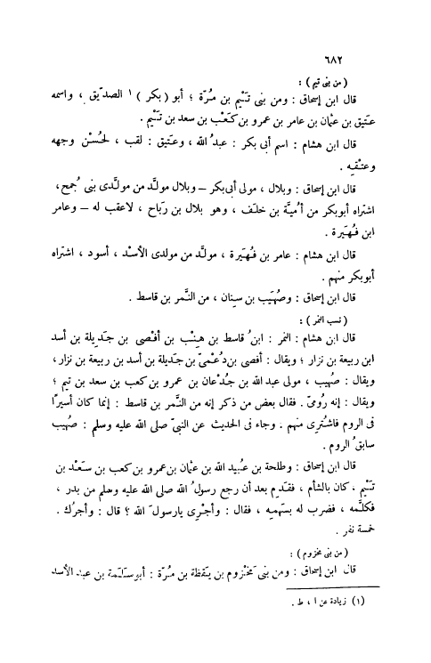 قَالَ ابْنُ هِشَامٍ: النَّمِرُ: ابْنُ قَاسِطِ بْنِ هِنْبِ بْنِ أَفْصَى بْنِ جَدِيلَةَ بْنِ أَسَدِ ابْن رَبِيعَةَ بْنِ نِزَارٍ، وَيُقَالُ: أَفْصَى بْنُ دُعْمِيِّ بْنِ جَدِيلَةَ بْنِ أَسَدِ بْنِ رَبِيعَةَ بْنِ نِزَارٍ، وَيُقَالُ: صُهَيْبٌ، مَوْلَى عَبْدِ اللَّهِ بْنِ جُدْعَانَ بْنِ عَمْرِو بْنِ كَعْبِ بْنِ سَعْدِ بْنِ تَيْمٍ، وَيُقَالُ: إنَّهُ رُومِيٌّ. فَقَالَ بَعْضُ مَنْ ذَكَرَ أَنَّهُ مِنْ النَّمِرِ بْنِ قَاسِطٍ: إنَّمَا كَانَ أَسِيرًا فِي الرُّومِ فَاشْتُرِيَ مِنْهُمْ. وَجَاءَ فِي الْحَدِيثِ عَنْ النَّبِيِّ صَلَّى اللهُ عَلَيْهِ وَسَلَّمَ: صُهَيْبٌ سَابِقُ الرُّومِ. قَالَ ابْنُ إسْحَاقَ: وَطَلْحَةُ بْنُ عُبَيْدِ اللَّهِ بْنِ عُثْمَانَ بْنِ عَمْرِو بْنِ كَعْبِ بْنِ سَعْدِ بْنِ تَيْمٍ، كَانَ بِالشَّأْمِ، فَقَدِمَ بَعْدَ أَنْ رَجَعَ رَسُولُ اللَّهِ صَلَّى اللهُ عَلَيْهِ وَسَلَّمَ مِنْ بَدْرٍ، فَكَلَّمَهُ، فَضَرَبَ لَهُ بِسَهْمِهِ، فَقَالَ: وَأَجْرِي يَا رَسُولَ اللَّهِ؟ قَالَ: وَأَجْرُكَ. خَمْسَةُ نَفَرٍ.