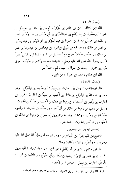 قَالَ ابْنُ هِشَامٍ: كَثِيرٌ مِنْ أَهْلِ الْعِلْمِ، غَيْرَ ابْنِ إسْحَاقَ، يَذْكُرُونَ فِي الْمُهَاجِرِينَ بِبَدْرٍ، فِي بَنِي عَامِرِ بْنِ لُؤَيٍّ: وَهْبَ بْنَ سَعْدِ بْنِ أَبِي سَرْحٍ، وَحَاطِبَ بْنَ عَمْرٍو، وَفِي بَنِي الْحَارِثِ بْنِ فِهْرٍ: عِيَاضَ [1] بْنَ زُهَيْرٍ.