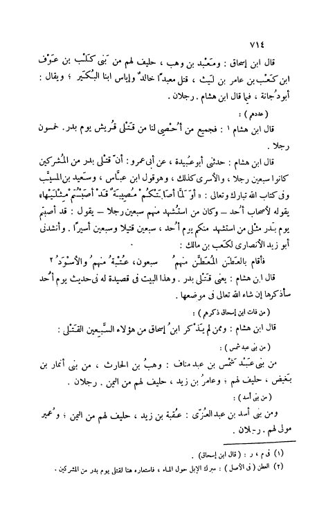 قَالَ ابْنُ هِشَامٍ: حَدَّثَنِي أَبُو عُبَيْدَةَ، عَنْ أَبِي عَمْرٍو: أَنَّ قَتْلَى بَدْرٍ مِنْ الْمُشْرِكِينَ كَانُوا سَبْعِينَ رَجُلًا، وَالْأَسْرَى كَذَلِكَ، وَهُوَ قَوْلُ ابْنِ عَبَّاسٍ، وَسَعِيدِ بْنِ الْمُسَيِّبِ وَفِي كِتَابِ اللَّهِ تَبَارَكَ وَتَعَالَى: أَوَلَمَّا أَصابَتْكُمْ مُصِيبَةٌ قَدْ أَصَبْتُمْ مِثْلَيْها 3: 165 يَقُولُهُ لِأَصْحَابِ أُحُدٍ- وَكَانَ مَنْ اُسْتُشْهِدَ مِنْهُمْ سَبْعِينَ رَجُلًا- يَقُولُ: قَدْ أَصَبْتُمْ يَوْمَ بَدْرٍ مِثْلَيْ مَنْ اُسْتُشْهِدَ مِنْكُمْ يَوْمَ أُحُدٍ، سَبْعِينَ قَتِيلًا وَسَبْعِينَ أَسِيرًا. وَأَنْشَدَنِي أَبُو زَيْدٍ الْأَنْصَارِيُّ لِكَعْبِ بْنِ مَالِكٍ: