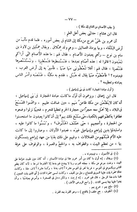 قَالَ ابْنُ إسْحَاقَ: وَيَزْعُمُونَ أَنَّ أَوَّلَ مَا كَانَتْ عِبَادَةُ الْحِجَارَةِ فِي بَنِي إسْمَاعِيلَ، أَنَّهُ كَانَ لَا يَظْعَنُ مِنْ مَكَّةَ ظَاعِنٌ مِنْهُمْ، حِينَ ضَاقَتْ عَلَيْهِمْ، وَالْتَمَسُوا الفَسَحَ فِي الْبِلَادِ، إلَّا حَمَلَ مَعَهُ حَجَرًا مِنْ حِجَارَةِ الْحَرَمِ تَعْظِيمًا لِلْحَرَمِ، فَحَيْثُمَا نَزَلُوا وَضَعُوهُ فَطَافُوا بِهِ كَطَوَافِهِمْ بِالْكَعْبَةِ، حَتَّى سَلَخَ ذَلِكَ بِهِمْ [3] إلَى أَنْ كَانُوا يَعْبُدُونَ مَا اسْتَحْسَنُوا مِنْ الْحِجَارَةِ، وَأَعْجَبَهُمْ، حَتَّى خَلَفَ الْخُلُوفُ [4] ، وَنَسُوا مَا كَانُوا عَلَيْهِ، وَاسْتَبْدَلُوا بِدِينِ إبْرَاهِيمَ وَإِسْمَاعِيلَ غَيْرَهُ، فَعَبَدُوا الْأَوْثَانَ، وَصَارُوا إلَى مَا كَانَتْ عَلَيْهِ الْأُمَمُ قَبْلَهُمْ مِنْ الضَّلَالَاتِ، وَفِيهِمْ عَلَى ذَلِكَ بَقَايَا مِنْ عَهْدِ إبْرَاهِيمَ يَتَمَسَّكُونَ بِهَا، مِنْ تَعْظِيمِ الْبَيْتِ، وَالطَّوَافِ بِهِ، وَالْحَجِّ وَالْعُمْرَةِ، وَالْوُقُوفِ عَلَى عَرَفَةَ