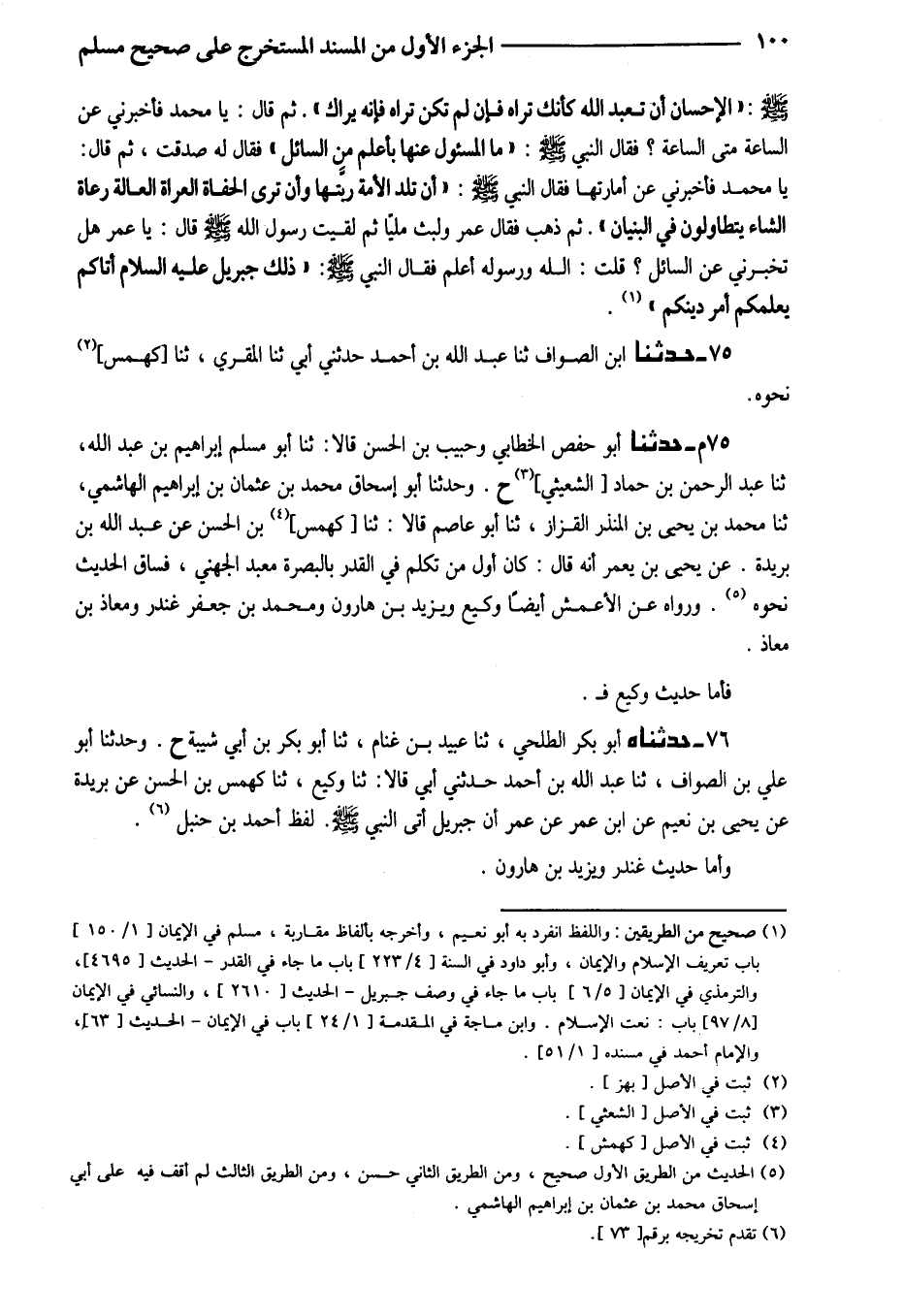76 - حَدَّثَنَاهُ أَبُو بَكْرٍ الطَّلْحِيُّ ثَنَا عُبَيْدُ بْنُ غَنَّامٍ ثَنَا أَبُو بَكْرِ بْنُ أَبِي شَيْبَةَ ح وَحَدَّثَنَا أَبُو عَلِيِّ بْنُ الصَّوَّافِ ثَنَا عَبْدُ اللَّهِ بْنُ أَحْمَدَ حَدَّثَنِي أَبِي قَالا ثَنَا وَكِيعٌ ثَنَا كَهْمَسُ بْنُ الْحَسَنِ عَنْ بُرَيْدَةَ عَنْ يَحْيَى بْنِ نُعَيْمٍ عَنِ ابْنِ عُمَرَ عَنْ عُمَرَ أَنَّ جِبْرِيلَ أَتَى النَّبِيَّ صَلَّى اللَّهُ عَلَيْهِ وَسَلَّمَ لَفْظُ أَحْمَدَ بْنِ حَنْبَلٍ وَأَمَّا حَدِيثُ غُنْدَرٍ وَيَزِيدَ بْنِ هَارُونَ