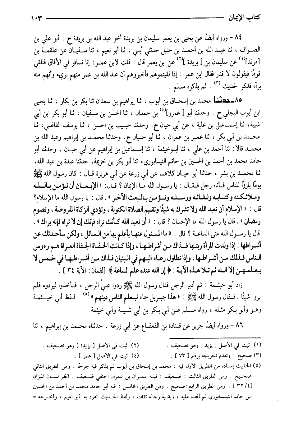 85 - حَدَّثَنَا مُحَمَّدُ بْنُ إِسْحَاقَ بْنِ أَيُّوبَ ثَنَا إِبْرَاهِيمُ بْنُ سَعْدَانَ ثَنَا بَكْرُ بن بكار ثَنَا يحيى ابْن أَيُّوبَ الْبَجَلِيُّ ح وَحَدَّثَنَا أَبُو عَمْرِو بْنُ حَمْدَانَ ثَنَا الْحَسَنُ بْنُ سُفْيَانَ ثَنَا أَبُو بَكْرِ ابْن أَبِي شَيْبَةَ ثَنَا إِسْمَاعِيلُ بْنُ عُلَيَّةَ عَنْ أَبِي حَيَّانَ ح وَحَدَّثَنَا حَبِيبُ بْنُ الْحَسَنِ ثَنَا يُوسُفُ الْقَاضِي ثَنَا مُحَمَّدُ بْنُ أَبِي بَكْرٍ ثَنَا عُمَرُ بْنُ عِمْرَانَ ثَنَا أَبُو حَيَّانَ ح وَحَدَّثَنَا مُحَمَّدُ بْنُ إِبْرَاهِيمَ وَعَبْدُ اللَّهِ بْنُ مُحَمَّدٍ قَالا ثَنَا أَحْمَدُ بْنُ عَلِيٍّ ثَنَا أَبُو خَيْثَمَةَ ثَنَا إِسْمَاعِيلُ بْنُ إِبْرَاهِيمَ عَنْ أَبِي حَيَّانَ وَحَدَّثَنَا أَبُو حَامِدٍ مُحَمَّدُ بْنُ أَحْمَدَ بْنِ الْحُسَيْنِ بْنِ حَاتِمٍ النَّيْسَابُورِيُّ ثَنَا أَبُو بَكْرِ بْنُ خُزَيْمَةَ حَدَّثَنَا عَبْدَةُ بْنُ عَبْدِ اللَّهِ ثَنَا مُحَمَّدُ بْنُ بِشْرٍ حَدَّثَنَا أَبُو حَيَّانَ كِلاهُمَا عَنْ أَبِي زُرْعَةَ عَنْ أَبِي هُرَيْرَةَ قَالَ كَانَ رَسُولُ اللَّهِ صَلَّى اللَّهُ عَلَيْهِ وَسَلَّمَ يَوْمًا بَارِزًا لِلنَّاسِ فَأَتَاهُ رَجُلٌ فَقَالَ يَا رَسُولَ اللَّهِ مَا الإِيمَانُ قَالَ (الإِيمَانُ أَنْ تُؤْمِنَ بِاللَّهِ وَمَلائِكَتِهِ وَكِتَابِهِ وَلِقَائِهِ وَرُسُلِهِ وَتُؤْمِنَ بِالْبَعْثِ الآخِرِ) قَالَ يَا رَسُولَ اللَّهِ مَا الإِسْلامُ قَالَ الإِسْلامُ أَنْ تَعْبُدَ اللَّهَ وَلا تُشْرِكَ بِهِ شَيْئًا وَتُقِيمَ الصَّلاةَ الْمَكْتُوبَةَ وَتُؤَدِّيَ الزَّكَاةَ الْمَفْرُوضَةَ وَتَصُومَ رَمَضَانَ قَالَ يَا رَسُولَ اللَّهِ مَا الإِحْسَانُ (قَالَ أَنْ تَعْبُدَ اللَّهَ كَأَنَّكَ تَرَاهُ فَإِنَّكَ إِنْ لَا تَرَاهُ فَإِنَّهُ يَرَاكَ)