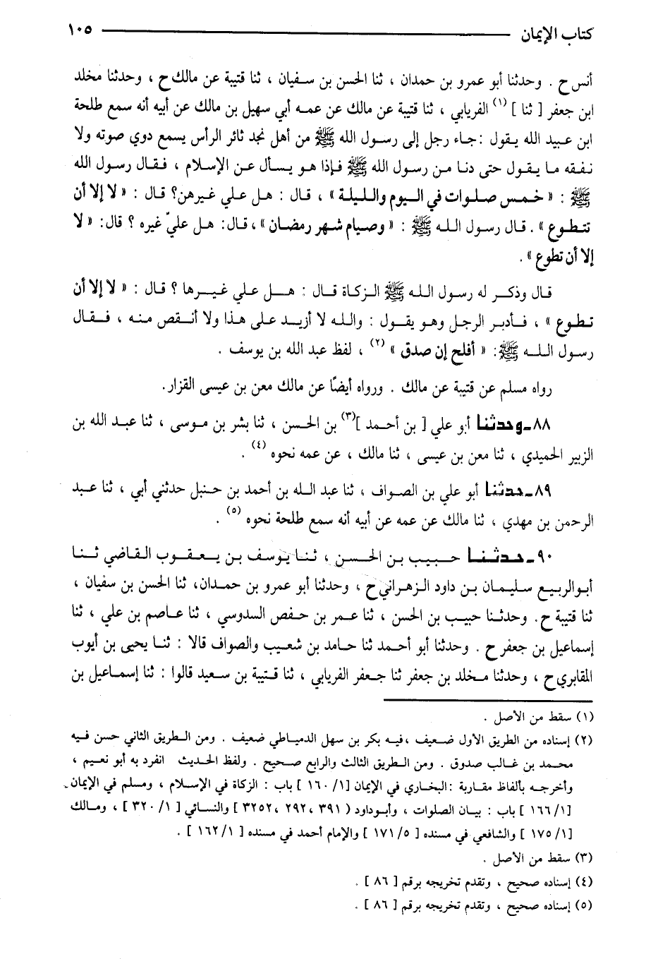 أَنَسٍ ح وَحَدَّثَنَا أَبُو عَمْرِو بْنُ حَمْدَانَ ثَنَا الْحَسَنُ بْنُ سُفْيَانَ ثَنَا قُتَيْبَةُ عَنْ مَالِكٍ ح وَحدثنَا مخلد ابْن جَعْفَرٍ ثَنَا الْفِرْيَابِيُّ ثَنَا قُتَيْبَةُ عَنْ مَالِكٍ عَنْ عَمِّهِ أَبِي سُهَيْلِ بْنِ مَالِكٍ عَنْ أَبِيهِ أَنه سمع طَلْحَة ابْن عُبَيْدِ اللَّهِ يَقُولُ جَاءَ رَجُلٌ إِلَى رَسُولِ اللَّهِ صَلَّى اللَّهُ عَلَيْهِ وَسَلَّمَ مِنْ أَهْلِ نَجْدٍ ثَائِرُ الرَّأْسِ يُسْمَعُ دَوِيُّ صَوْتِهِ وَلا نَفْقَهُ مَا يَقُولُ حَتَّى دَنَا مِنْ رَسُولِ اللَّهِ صَلَّى اللَّهُ عَلَيْهِ وَسَلَّمَ فَإِذَا هُوَ يَسْأَلُ عَنِ الإِسْلامِ فَقَالَ رَسُولُ اللَّهِ صَلَّى اللَّهُ عَلَيْهِ وَسَلَّمَ (خَمْسُ صَلَوَاتٍ فِي الْيَوْمِ وَاللَّيْلَةِ) قَالَ هَلْ عَلَيَّ غَيْرُهُنَّ قَالَ (لَا إِلَّا أَن تتطوع) قَالَ رَسُولُ اللَّهِ صَلَّى اللَّهُ عَلَيْهِ وَسَلَّمَ (وَصِيَامُ شَهْرِ رَمَضَانَ) قَالَ هَلْ عَلَيَّ غَيْرُهُ قَالَ (لَا إِلا أَنْ تَطَوَّعَ)