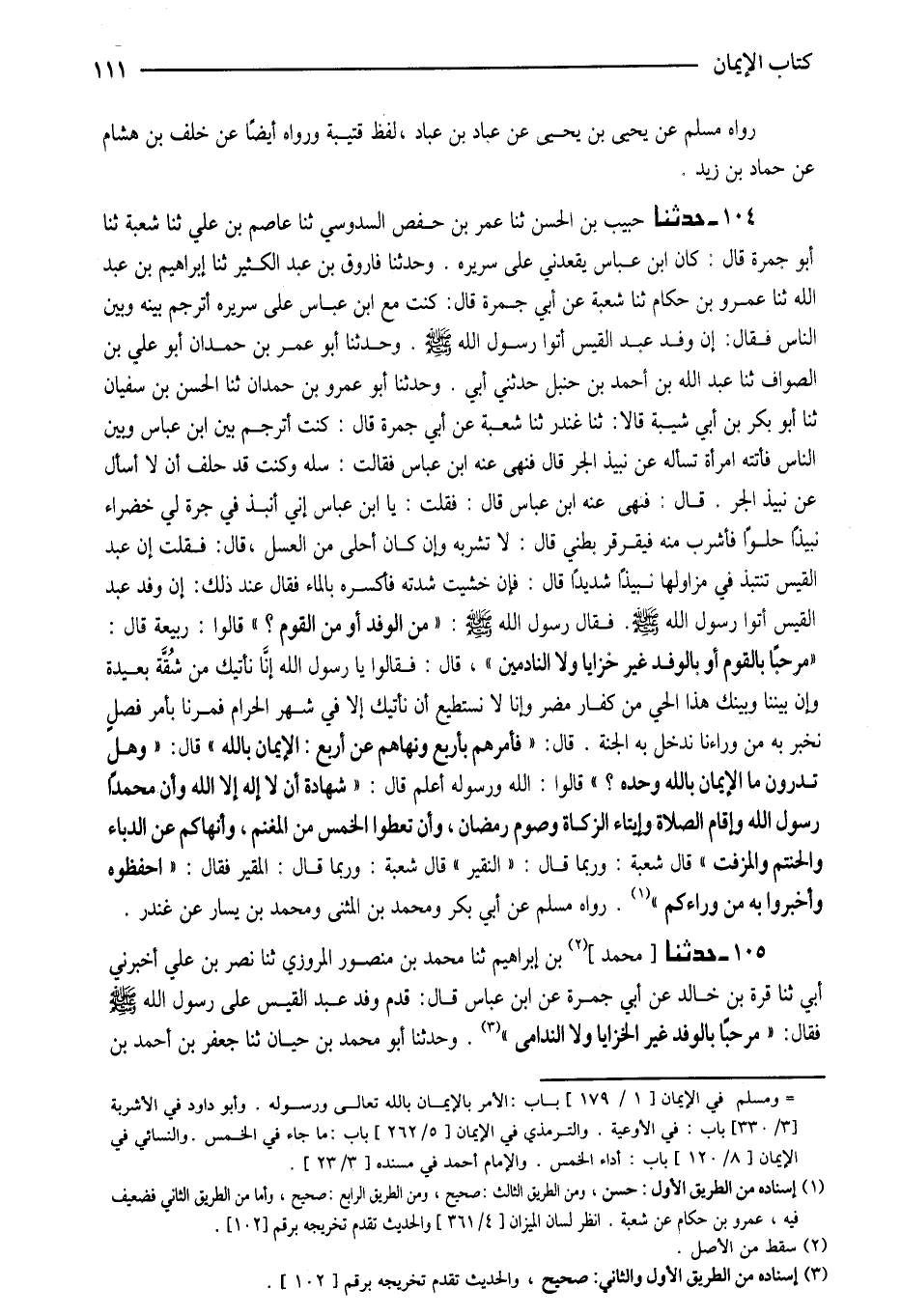 104 - حَدَّثَنَا حَبِيبُ بْنُ الْحَسَنِ ثَنَا عُمَرُ بْنُ حَفْصٍ السَّدُوسِيُّ ثَنَا عَاصِمُ بْنُ عَلِيٍّ ثَنَا شُعْبَةُ ثَنَا أَبُو جَمْرَةَ قَالَ كَانَ ابْنُ عَبَّاسٍ يُقْعِدُنِي عَلَى سَرِيرِهِ وَحَدَّثَنَا فَارُوقُ بْنُ عَبْدِ الْكَثِيرِ ثَنَا إِبْرَاهِيمُ بْنُ عَبْدِ اللَّهِ ثَنَا عَمْرُو بْنُ حَكَّامٍ ثَنَا شُعْبَةُ عَنْ أَبِي جَمْرَةَ قَالَ كُنْتُ مَعَ ابْنِ عَبَّاسٍ عَلَى سَرِيرِهِ أُتَرْجِمُ بَيْنَهُ وَبَيْنِ النَّاسِ فَقَالَ إِنَّ وَفْدَ عَبْدِ الْقَيْسِ أَتَوْا رَسُولَ اللَّهِ صَلَّى اللَّهُ عَلَيْهِ وَسَلَّمَ وَحَدَّثَنَا أَبُو عُمَرَ بْنُ حَمْدَانَ أَبُو عَلِيِّ بْنُ الصَّوَّافِ ثَنَا عَبْدُ اللَّهِ بْنُ أَحْمَدَ بْنِ حَنْبَلٍ حَدَّثَنِي أَبِي وَحَدَّثَنَا أَبُو عَمْرِو بْنُ حَمْدَانَ ثَنَا الْحَسَنُ بْنُ سُفْيَانَ ثَنَا أَبُو بَكْرِ بْنِ أَبِي شَيْبَةَ قَالا ثَنَا غُنْدَرٌ ثَنَا شُعْبَةُ عَنْ أَبِي جَمْرَةَ قَالَ كُنْتُ أُتَرْجِمُ بَيْنَ ابْنِ عَبَّاسٍ وَبَيْنَ النَّاسِ فَأَتَتْهُ امْرَأَةٌ تَسْأَلُهُ عَنْ نَبِيذِ الْجَرِّ قَالَ فَنَهَى عَنْهُ ابْنُ عَبَّاسٍ فَقَالَتْ سَلْهُ وَكُنْتُ وَقَدْ حَلَفَ أَنْ لَا أَسْأَلُ عَنْ نَبِيذِ الْجَرِّ قَالَ فَنَهَى عَنْهُ ابْنُ عَبَّاسٍ قَالَ فَقُلْتُ يَا ابْنَ عَبَّاسٍ إِنِّي أَنْبِذُ فِي جَرَّةٍ لِي خَضْرَاءَ نَبِيذًا حُلْوًا فَأَشْرَبُ مِنْهُ فَيُقَرْقِرُ بَطْنِي قَالَ لَا تَشْرَبْهُ وَإِنْ كَانَ أَحْلَى مِنَ الْعَسَلِ قَالَ فَقُلْتُ إِنَّ عَبْدَ الْقَيْسِ تَنْتَبِذُ فِي مَزَاوِلِهَا نَبِيذًا شَدِيدًا قَالَ فَإِنْ خَشِيتُ شِدَّتَهُ فَأَكْسَرُهُ بِالْمَاءِ فَقَالَ عِنْدَ ذَلِكَ إِنَّ وَفْدَ عَبْدِ الْقَيْسِ أَتَوْا رَسُولُ اللَّهِ صَلَّى اللَّهُ عَلَيْهِ وَسَلَّمَ فَقَالَ رَسُولُ اللَّهِ صَلَّى اللَّهُ عَلَيْهِ وَسَلَّمَ (مَنِ الْوَفْدُ أَوْ مَنِ الْقَوْمُ) قَالُوا رَبِيعَةَ قَالَ (مرْحَبًا بالقوم أَو الْوَفْد غَيْرَ خَزَايَا وَلا النَّادِمِينَ) قَالَ فَقَالُوا يَا رَسُولَ اللَّهِ إِنَّا نَأْتِيكَ مِنْ شُقَّةٍ بَعِيدَةٍ وَإِنَّ بَيْنَنَا وَبَيْنَكَ هَذَا الْحَيَّ مِنْ كُفَّارِ مُضَرَ وَإِنَّا لَا نَسْتَطِيعُ أَنْ نَأْتِيَكَ إِلا فِي شَهْرِ الْحَرَامِ فَمُرْنَا بِأَمْرٍ فَصْلٍ نُخْبِرُ بِهِ مَنْ وَرَاءَنَا نَدْخُلُ بِهِ الْجَنَّةَ قَالَ (فَأَمَرَهُمْ بِأَرْبَعٍ وَنَهَاهُمْ عَنْ أَرْبَعٍ الإِيمَانُ بِاللَّهِ) قَالَ (وَهَلْ تَدْرُونَ مَا الإِيمَانُ بِاللَّهِ وَحْدَهُ) قَالُوا اللَّهُ وَرَسُولُهُ أَعْلَمُ قَالَ (شَهَادَةُ أَنْ لَا إِلَهَ إِلا اللَّهُ وَأَنَّ مُحَمَّدًا رَسُولُ اللَّهُ وَإِقَامِ الصَّلاةِ وَإِيتَاءِ الزَّكَاةِ وَصَوْمُ رَمَضَانَ وَأَنْ تُعْطُوا الْخُمُسَ مِنَ الْمَغْنَمِ وَأَنْهَاكُمْ عَنِ الدُّبَّاءِ وَالْحَنْتَمِ وَالْمُزَفَّتِ) قَالَ شُعْبَةُ وَرُبَّمَا قَالَ النَّقِيرِ قَالَ شُعْبَةُ وَرُبَّمَا قَالَ الْمُقَيَّرِ فَقَالَ (احْفَظُوهُ وَأَخْبِرُوا بِهِ مَنْ وَرَاءَكُمْ) رَوَاهُ مُسْلِمٌ عَنْ أَبِي بَكْرٍ وَمُحَمَّدُ بْنُ الْمثنى وَمُحَمّد بن يسَار عَنْ غُنْدَرٍ