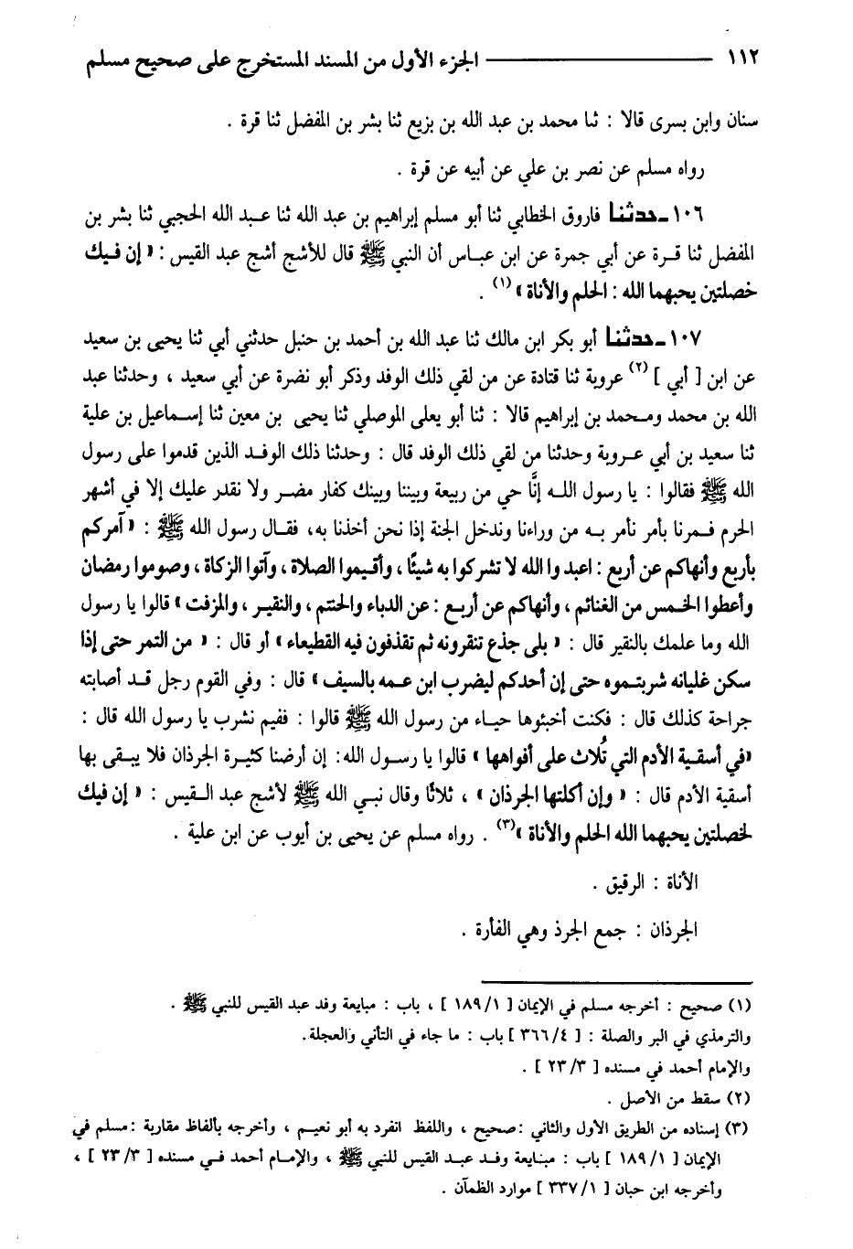 107 - حَدَّثَنَا أَبُو بَكْرِ بْنُ مَالِكٍ ثَنَا عَبْدُ اللَّهِ بْنُ أَحْمَدَ بْنِ حَنْبَلٍ حَدَّثَنِي أَبِي ثَنَا يَحْيَى بْنُ سَعِيدٍ عَنِ ابْنِ أَبِي عَرُوبَةَ ثَنَا قَتَادَةُ عَنْ مَنْ لَقِيَ ذَلِكَ الْوَفْدَ وَذَكَرَ أَبُو نَضْرَةَ عَنْ أَبِي سَعِيدٍ وَحَدَّثَنَا عَبْدُ اللَّهِ بْنُ مُحَمَّدٍ وَمُحَمَّدُ بْنُ إِبْرَاهِيمَ قَالا ثَنَا أَبُو يَعْلَى الْمَوْصِلِيُّ ثَنَا يَحْيَى بْنُ مَعِينٍ ثَنَا إِسْمَاعِيلُ بْنُ عُلَيَّةَ ثَنَا سَعِيدُ بْنُ أَبِي عَرُوبَةَ وَحَدَّثَنَا مَنْ لَقِيَ ذَلِكَ الْوَفْدَ قَالَ وَحَدَّثَنَا ذَلِكَ الْوَفْدُ الَّذِينَ قَدِمُوا عَلَى رَسُولِ اللَّهِ صَلَّى اللَّهُ عَلَيْهِ وَسَلَّمَ فَقَالُوا يَا رَسُولَ اللَّهِ إِنَّا حَيٌّ مِنْ رَبِيعَةَ وَبَيْنَنَا وَبَيْنَكَ كُفَّارُ مُضَرَ وَلا نَقْدِرُ عَلَيْكَ إِلا فِي أَشْهُرِ الْحُرُمِ فَمُرْنَا بِأَمْرٍ نَأْمُرُ بِهِ مَنْ وَرَاءَنَا وَنَدْخُلُ الْجَنَّةَ إِذَا نَحْنُ أَخَذْنَا بِهِ فَقَالَ رَسُولُ اللَّهِ صَلَّى اللَّهُ عَلَيْهِ وَسَلَّمَ (آمُرُكُمْ بِأَرْبَعٍ وَأَنْهَاكُمْ عَنْ أَرْبَعٍ اعْبُدُوا اللَّهَ لَا تُشْرِكُوا بِهِ شَيْئًا وَأَقِيمُوا الصَّلاةَ وَآتُوا الزَّكَاةَ وَصُومُوا رَمَضَانَ وَأَعْطُوا الْخُمُسَ مِنَ الْغَنَائِمِ وَأَنْهَاكُمْ عَنْ أَرْبَعٍ عَنِ الدُّبَّاءِ وَالْحَنْتَمِ وَالنَّقِيرِ وَالْمُزَفَّتِ) قَالُوا يَا رَسُولَ اللَّهِ وَمَا عِلْمُكَ بِالنَّقِيرِ قَالَ (بَلَى جِذْعٌ تَنْقُرُونَهُ ثُمَّ تَقْذِفُونَ فِيهِ الْقُطَيْعَاءَ) أَوْ قَالَ (مِنَ التَّمْرِ حَتَّى إِذَا سَكَنَ غَلَيَانُهُ شَرِبْتُمُوهُ حَتَّى إِنَّ أَحَدَكُمْ لَيَضْرِبُ ابْنَ عَمِّهِ بِالسَّيْفِ) قَالَ وَفِي الْقَوْمِ رَجُلٌ قَدْ أَصَابَتْهُ جِرَاحَةٌ كَذَلِكَ قَالَ فَكُنْتُ أَخْبَئُوهَا حَيَاءً مِنْ رَسُولُ اللَّهِ صَلَّى اللَّهُ عَلَيْهِ وَسَلَّمَ قَالُوا فَفِيمَ نَشْرَبُ يَا رَسُولَ اللَّهِ قَالَ (فِي أَسْقِيَةِ الْأدم الَّتِي تلاث عَلَى أَفْوَاهِهَا) قَالُوا يَا رَسُولَ اللَّهِ إِنَّ أَرْضَنَا كَثِيرَةُ الْجِرْذَانِ فَلا يَبْقَى بِهَا أَسْقِيَةُ الأَدَمِ قَالَ (وَإِنْ أَكَلَتْهَا الْجِرْذَانُ) ثَلاثًا وَقَالَ نَبِيُّ اللَّهُ صَلَّى اللَّهُ عَلَيْهِ وَسَلَّمَ لأَشَجِّ عَبْدِ الْقَيْسِ (إِنَّ فِيكَ لَخَصْلَتَيْنِ يُحِبُّهُمَا اللَّهُ الْحِلْمُ وَالأَنَاةُ) رَوَاهُ مُسْلِمٌ عَنْ يَحْيَى بْنِ أَيُّوبَ عَنِ ابْنِ عُلَيَّةَ
