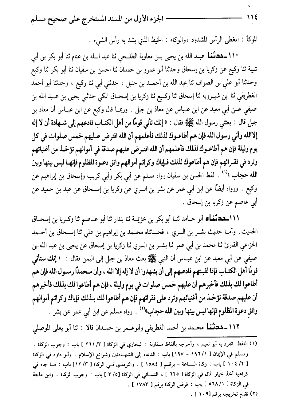 110 - حَدَّثَنَا عَبْدُ اللَّهِ بْنُ يَحْيَى بْنِ مُعَاوِيَةَ الطَّلْحِيُّ ثَنَا عَبْدُ اللَّهِ بْنُ غَنَّامٍ ثَنَا أَبُو بَكْرِ بْنُ أَبِي شَيْبَةَ ثَنَا وَكِيعٌ عَنْ زَكَرِيَّا بْنِ إِسْحَاقَ وَحَدَّثَنَا أَبُو عَمْرِو بْنُ حَمْدَانَ ثَنَا الْحَسَنُ بْنُ سُفْيَانَ ثَنَا أَبُو بَكْرٍ ثَنَا وَكِيعٌ وَحَدَّثَنَا أَبُو عَلِيِّ بْنُ الصَّوَّافِ ثَنَا عَبْدُ اللَّهِ بْنُ أَحْمَدَ بْنِ حَنْبَلٍ حَدَّثَنِي أَبِي ثَنَا وَكِيعٌ وَحَدَّثَنَا أَبُو أَحْمَدَ الْغِطْرِيفِيُّ ثَنَا ابْنُ شِيرَوَيْهِ ثَنَا إِسْحَاقُ ثَنَا وَكِيعٌ ثَنَا زَكَرِيَّا بْنُ إِسْحَاقَ الْمَكِّيُّ حَدَّثَنِي يَحْيَى بْنُ عَبْدِ اللَّهِ بْنِ صَيْفِيٍّ عَنْ أَبِي مَعْبَدٍ عَنِ ابْنِ عَبَّاسٍ عَنْ مُعَاذِ بْنِ جَبَلٍ وَرُبَّمَا قَالَ وَكِيعٌ عَنِ ابْنِ عَبَّاسٍ أَنَّ مُعَاذَ بْنَ جَبَلٍ قَالَ بَعَثَنِي رَسُولُ اللَّهِ صَلَّى اللَّهُ عَلَيْهِ وَسَلَّمَ فَقَالَ (إِنَّكَ تَأْتِي قَوْمًا مِنْ أَهْلِ الْكِتَابِ فَادْعُهُمْ إِلَى شَهَادَةِ أَنْ لَا إِلَهَ إِلا اللَّهُ وَأَنِّي رَسُولُ اللَّهِ فَإِنْ هُمْ أَطَاعُوكَ لِذَلِكَ فَأَعْلِمْهُمْ أَنَّ اللَّهَ افْتَرَضَ عَلَيْهِمْ خَمْسَ صَلَوَاتٍ فِي كُلِّ يَوْمٍ وَلَيْلَةٍ فَإِنْ هُمْ أَطَاعُوكَ لِذَلِكَ فَأَعْلِمْهُمْ أَنَّ اللَّهَ افْتَرَضَ عَلَيْهِمْ صَدَقَةً فِي أَمْوَالِهِمْ تُؤْخَذُ مِنْ أَغْنِيَائِهِمْ وَتُرَدُّ فِي فُقَرَائِهِمْ فَإِنْ هُمْ أَطَاعُوكَ لِذَلِكَ فَإِيَّاكَ وَكَرَائِمَ أَمْوَالِهِمْ وَاتَّقِ دَعْوَةَ الْمَظْلُومِ فَإِنَّهَا لَيْسَ بَيْنَهَا وَبَيْنَ اللَّهِ حِجَابٌ) لَفْظُ الْحَسَنِ بْنِ سُفْيَانَ رَوَاهُ مُسْلِمٌ عَنْ أَبِي بَكْرٍ وَأَبِي كُرَيْبٍ وَإِسْحَاقَ بْنِ إِبْرَاهِيمَ عَنْ وَكِيعٍ وَرَوَاهُ أَيْضًا عَنِ ابْنِ أَبِي عُمَرَ عَنْ بِشْرِ بْنِ السَّرِيِّ عَنْ زَكَرِيَّا بْنِ إِسْحَاقَ عَنْ عَبْدِ بْنِ حُمَيْدٍ عَنْ أَبِي عَاصِمٍ عَنْ زَكَرِيَّا بْنِ إِسْحَاقَ