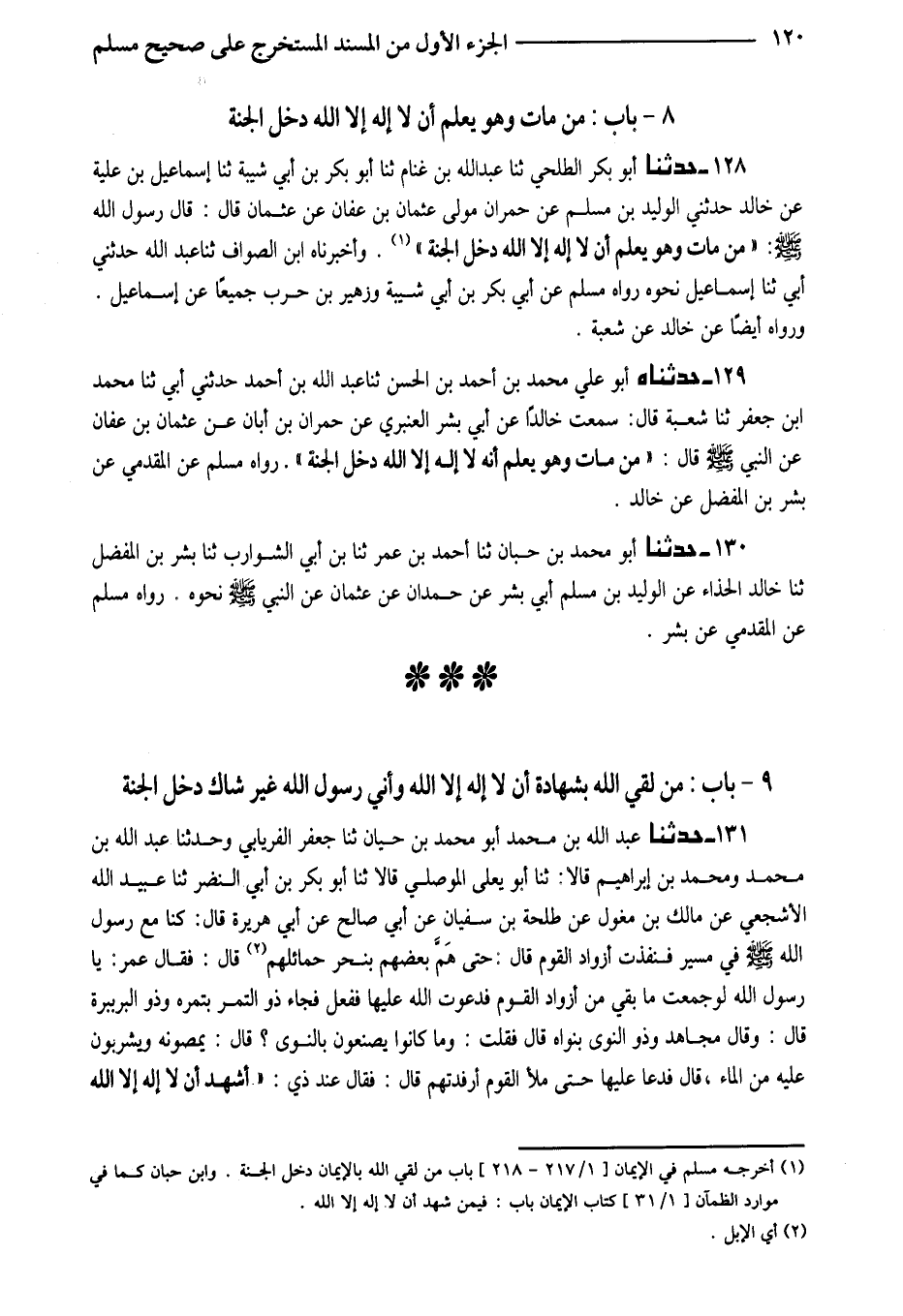 128 - حَدَّثَنَا أَبُو بَكْرٍ الطَّلْحِيُّ ثَنَا عَبْدُ اللَّهِ بْنُ غَنَّامٍ ثَنَا أَبُو بَكْرِ بْنُ أَبِي شَيْبَةَ ثَنَا إِسْمَاعِيلُ بْنُ عُلَيَّةَ عَنْ خَالِدٍ حَدَّثَنِي الْوَلِيدُ بْنُ مُسْلِمٍ عَنْ حُمْرَانَ مَوْلَى عُثْمَانَ بْنِ عَفَّانَ عَنْ عُثْمَانَ قَالَ قَالَ رَسُولُ اللَّهِ صَلَّى اللَّهُ عَلَيْهِ وَسَلَّمَ (مَنْ مَاتَ وَهُوَ يَعْلَمُ أَنْ لَا إِلَهَ إِلا اللَّهُ دَخَلَ الْجَنَّةَ) وَأَخْبَرَنَاهُ ابْنُ الصَّوَّافِ ثَنَا عَبْدُ اللَّهِ حَدَّثَنِي أَبِي ثَنَا إِسْمَاعِيلُ نَحْوَهُ رَوَاهُ مُسْلِمٌ عَنْ أَبِي بَكْرِ بْنِ أبي شيبَة وَزُهَيْر بن حَرْب جَمِيعًا عَنْ إِسْمَاعِيلَ وَرَوَاهُ أَيْضًا عَنْ خَالِدٍ عَنْ شُعْبَةَ