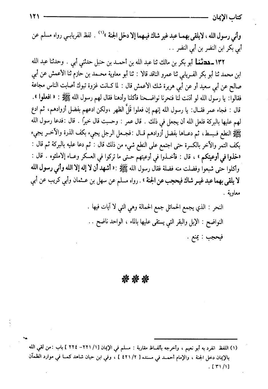 132 - حَدَّثَنَا أَبُو بَكْرِ بْنُ مَالِكٍ ثَنَا عَبْدُ اللَّهِ بْنُ أَحْمَدَ بْنِ حَنْبَلٍ حَدَّثَنِي أَبِي وَحَدَّثَنَا عَبْدُ الله ابْن مُحَمَّد أَبُو بَكْرٍ الْفِرْيَابِيُّ ثَنَا عَمْرٌو النَّاقِدُ قَالا ثَنَا أَبُو مُعَاوِيَةَ مُحَمَّدُ بْنُ حَازِمٍ ثَنَا الأَعْمَشُ عَنْ أَبِي صَالِحٍ عَنْ أَبِي سَعِيدٍ أَوْ عَنْ أَبِي هُرَيْرَةَ شَكَّ الأَعْمَشُ قَالَ لَمَّا كَانَتْ غَزْوَةُ تَبُوكَ أَصَابَتِ النَّاسَ مَجَاعَةٌ فَقَالُوا يَا رَسُولَ اللَّهِ لَوْ أَذَنْتَ لَنَا فَنَحَرْنَا نَوَاضِحَنَا فَأَكَلْنَا وَادَّهَنَّا فَقَالَ لَهُمْ رَسُولُ اللَّهِ صَلَّى اللَّهُ عَلَيْهِ وَسَلَّمَ (افْعَلُوا) قَالَ فَجَاءَ عُمَرُ فَقَالَ يَا رَسُولَ اللَّهِ إِنَّهُمْ فَعَلُوا قَلَّ الظَّهْرُ وَلَكِنَّ ادْعُهُمْ بِفَضْلِ أَزْوَادِهِمْ ثُمَّ ادْعُ لَهُمْ عَلَيْهَا بِالْبَرَكَةِ فَلَعَلَّ اللَّهَ أَنْ يَجْعَلَ فِي ذَلِكَ قَالَ عُمَرُ وَحَسِبْتُ قَالَ خَيْرًا قَالَ فَدَعَا رَسُولُ اللَّهِ صَلَّى اللَّهُ عَلَيْهِ وَسَلَّمَ النِّطَعَ فَبَسَطَ ثُمَّ دَعَاهَا بِفَضْلِ أَزْوَادِهِمْ قَالَ فَجَعَلَ الرَّجُلَ يَجِيءُ بِكَفِّ الذُّرَةِ وَالآخَرُ يَجِيءُ بِكَفٍّ التَّمْرِ وَالآخَرُ بِالْكِسْرَةِ حَتَّى اجْتَمَعَ عَلَى النِّطَعِ شَيْءٌ مِنْ ذَلِكَ قَالَ ثُمَّ دَعَا عَلَيْهِ بِالْبَرَكَةِ ثُمَّ قَالَ (خُذُوا فِي أَوْعِيَتِكُمْ) قَالَ فَأَخَذُوا فِي أَوْعِيَتِهِمْ حَتَّى مَا تَرَكُوا فِي الْعَسْكَرِ وِعَاءً إِلا مَلَئُوهُ قَالَ وَأَكَلُوا حَتَّى شَبِعُوا وَفَضَلَتْ مِنْهُ فَضْلَةٌ فَقَالَ رَسُولُ اللَّهِ صَلَّى اللَّهُ عَلَيْهِ وَسَلَّمَ (أَشْهَدُ أَنْ لَا إِلَهَ إِلا اللَّهُ وَأَنِّي رَسُولُ اللَّهِ لَا يَلْقَى بِهِمَا عَبْدٌ غَيْرَ شَاكٍّ فيحجب عَنهُ الْجَنَّةِ) رَوَاهُ مُسْلِمٌ عَنْ سَهْلِ بْنِ عُثْمَانَ وَأَبِي كُرَيْبٍ عَنْ أَبِي مُعَاوِيَةَ النَّحْرُ الَّذِي يَجْمَعُ الْحَمَائِلَ جَمْعُ الْحِمَالَةِ وَهِيَ الَّتِي لَا آيَاتَ فِيهَا النَّوَاضِحُ الإِبِلُ وَالْبَقَرُ الَّتِي يُسْتَقَى عَلَيْهَا بِالْمَاءِ الْوَاحِدُ نَاضِحٌ فَيُحْجَبُ يُمْنَعُ