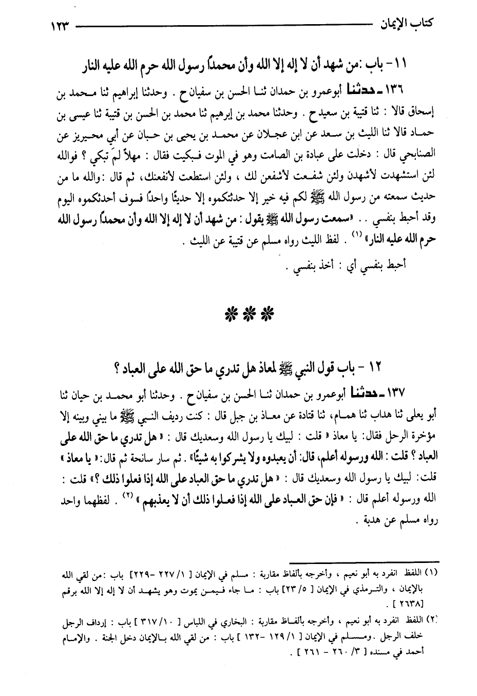 136 - حَدَّثَنَا أَبُو عَمْرِو بْنُ حَمْدَانَ ثَنَا الْحَسَنُ بْنُ سُفْيَانَ ح وَحَدَّثَنَا إِبْرَاهِيمُ ثَنَا مُحَمَّدُ بْنُ إِسْحَاقَ قَالا ثَنَا قُتَيْبَةُ بْنُ سَعِيدٍ ح وَحَدَّثَنَا مُحَمَّدُ بْنُ إِبْرَاهِيمَ ثَنَا مُحَمَّدُ بْنُ الْحَسَنِ بْنِ قُتَيْبَةَ ثَنَا عِيسَى بْنُ حَمَّادٍ قَالا ثَنَا اللَّيْثُ بْنُ سَعْدٍ عَنِ ابْنِ عَجْلانَ عَنْ مُحَمَّدِ بْنِ يَحْيَى بْنِ حِبَّانَ عَنْ أَبِي مُحَيْرِيزٍ عَنِ الصُّنَابِحِيِّ قَالَ دَخَلْتُ عَلَى عُبَادَةَ بْنِ الصَّامِتِ وَهُوَ فِي الْمَوْتِ فَبَكَيْتُ فَقَالَ مَهْلا لِمَ تَبْكِي فَوَاللَّهِ لَئِنِ اسْتُشْهِدْتُ لأَشْهَدَنَّ وَلَئِنْ شُفِّعْتُ لأَشْفَعَنَّ لَكَ وَلَئِنِ اسْتَطَعْتُ لأَنْفَعَنَّكَ ثُمَّ قَالَ وَاللَّهِ مَا مِنْ حَدِيثٍ سَمِعْتُهُ مِنْ رَسُولِ اللَّهِ صَلَّى اللَّهُ عَلَيْهِ وَسَلَّمَ لَكُمْ فِيهِ خَيْرٌ إِلا حَدَّثْتُكُمُوهُ إِلا حَدِيثًا وَاحِدًا فَسَوْفَ أُحَدِّثُكُمُوهُ الْيَوْم وَقد أحبط بنفسي (سَمِعْتُ رَسُولَ اللَّهِ صَلَّى اللَّهُ عَلَيْهِ وَسلم يَقُولُ مَنْ شَهِدَ أَنْ لَا إِلَه إِلَّا الله وَأَن مُحَمَّد رَسُولُ اللَّهِ حَرَّمَ اللَّهُ عَلَيْهِ النَّارَ) لَفْظُ اللَّيْثِ رَوَاهُ مُسْلِمٌ عَن قُتَيْبَة عَن اللَّيْث أحبط بِنَفْسِي أَيْ أَخَذَ بِنَفْسِي