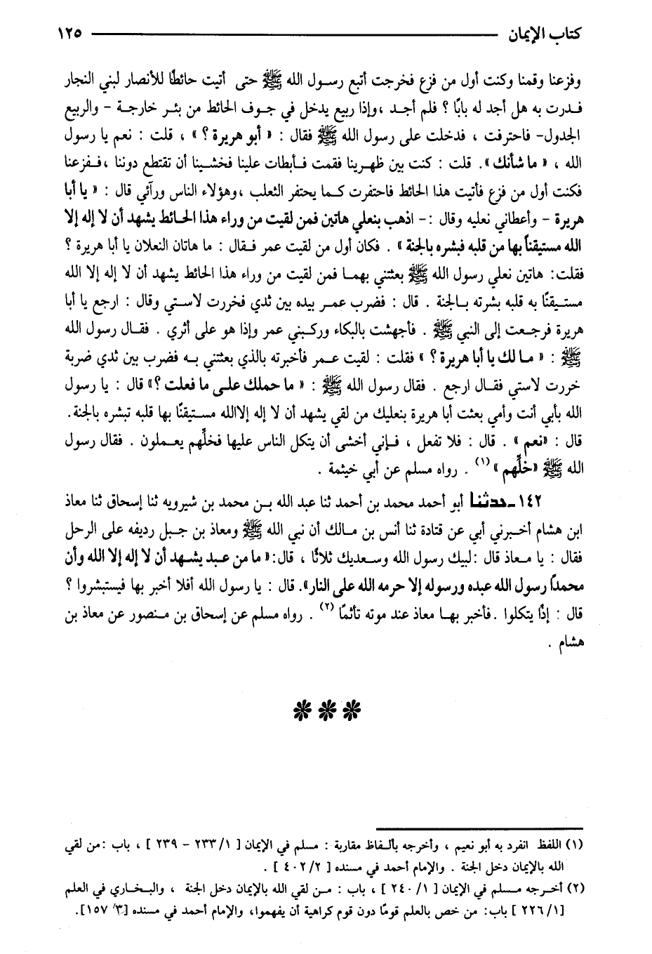 وَفَزِعْنَا وَقُمْنَا وَكُنْتُ أَوَّلَ مَنْ فَزِعَ فَخَرَجْتُ أَتْبَعُ رَسُولَ اللَّهِ صَلَّى اللَّهُ عَلَيْهِ وَسَلَّمَ حَتَّى أَتَيْتُ حَائِطًا لِلأَنْصَارِ لِبَنِي النَّجَّارِ فَدُرْتُ بِهِ هَلْ أَجِدُ لَهُ بَابًا فَلَمْ أَجِدْ وَإِذَا رَبِيعٌ يَدْخُلُ فِي جَوْفِ الْحَائِطِ مِنْ بِئْرِ خَارِجَةَ وَالرَّبِيعُ الْجَدْوَلُ فَاحْتَرَفْتُ فَدَخَلْتُ عَلَى رَسُولِ اللَّهِ صَلَّى اللَّهُ عَلَيْهِ وَسَلَّمَ فَقَالَ (أَبُو هُرَيْرَةَ) قُلْتُ نَعَمْ يَا رَسُولَ اللَّهِ (مَا شَأْنُكَ) قُلْتُ كُنْتَ بَيْنَ ظَهْرَيْنَا فَقُمْتَ فَأَبْطَأْتَ عَلَيْنَا فَخَشِينَا أَنْ تُقْتَطَعَ دُونَنَا فَفَزِعْنَا فَكُنْتُ أَوَّلَ مَنْ فَزِعَ فَأَتَيْتُ هَذَا الْحَائِطَ فَاحْتَفَرْتُ كَمَا يَحْتَفِرُ الثَّعْلَبُ وَهَؤُلاءِ النَّاسُ وَرَائِي قَالَ (يَا أَبَا هُرَيْرَةَ وَأَعْطَانِي نَعْلَيْهِ وَقَالَ اذْهَبْ بِنَعْلَيَّ هَاتَيْنِ فَمَنْ لَقِيتَ مِنْ وَرَاءِ هَذَا الْحَائِطِ يَشْهَدُ أَنْ لَا إِلَهَ إِلا اللَّهُ مُسْتَيْقِنًا بِهَا مِنْ قَلْبِهِ فَبَشِّرْهُ بِالْجَنَّةِ) فَكَانَ أَوَّلَ مَنْ لَقِيتُ عُمَرَ فَقَالَ مَا هَاتَانِ النَّعْلانِ يَا أَبَا هُرَيْرَةَ فَقُلْتُ هَاتَيْنِ نَعْلَيْ رَسُولِ اللَّهِ صَلَّى الله عَلَيْهِ وَسلم بعثتني بِهِمَا فَمَنْ لَقِيتُ مِنْ وَرَاءِ هَذَا الْحَائِطِ يَشْهَدُ أَنْ لَا إِلَهَ إِلا اللَّهُ مُسْتَيْقِنًا بِهِ قَلْبُهُ بَشَّرْتُهُ بِالْجَنَّةَ قَالَ فَضَرَبَ عمر بِيَدِهِ بَين ثدي فَخَرَرْت لَا ستي وَقَالَ ارْجَعْ يَا أَبَا هُرَيْرَةَ فَرَجَعْتُ إِلَى النَّبِيِّ صَلَّى اللَّهُ عَلَيْهِ وَسَلَّمَ فَأَجْهَشْتُ بِالْبُكَاءِ وَرَكِبَنِي عمر وَإِذا هُوَ عل أَثَرِي فَقَالَ رَسُولُ اللَّهِ صَلَّى اللَّهُ عَلَيْهِ وَسَلَّمَ (مَا لَكَ يَا أَبَا هُرَيْرَةَ) فَقُلْتُ لَقِيتُ عُمَرَ فَأَخْبَرْتُهُ بِالَّذِي بَعَثْتَنِي بِهِ فَضرب بَين ثدي ضَرْبَة خَرَرْت لَا ستي فَقَالَ ارْجَعْ فَقَالَ رَسُولُ اللَّهِ صلى الله عَلَيْهِ وَسلم (ماحملك عَلَى مَا فَعَلْتَ) قَالَ يَا رَسُولَ اللَّهِ بِأَبِي أَنْتَ وَأُمِّي بَعَثْتَ أَبَا هُرَيْرَةَ بِنَعْلَيْكَ مَنْ لَقِيَ يَشْهَدُ أَنْ لَا إِلَهَ إِلا اللَّهُ مُسْتَيْقِنًا بِهَا قَلْبُهُ تُبَشِّرُهُ بِالْجَنَّةِ قَالَ (نَعَمْ) قَالَ فَلا تَفْعَلْ فَأَنِّي أَخْشَى أَنْ يَتَّكِلَ النَّاسُ عَلَيْهَا فَخَلِّهِمْ يَعْمَلُونَ فَقَالَ رَسُولُ اللَّهِ صَلَّى اللَّهُ عَلَيْهِ وَسَلَّمَ (خَلِّهِمْ) رَوَاهُ مُسْلِمُ عَنْ أَبِي خَيْثَمَةَ