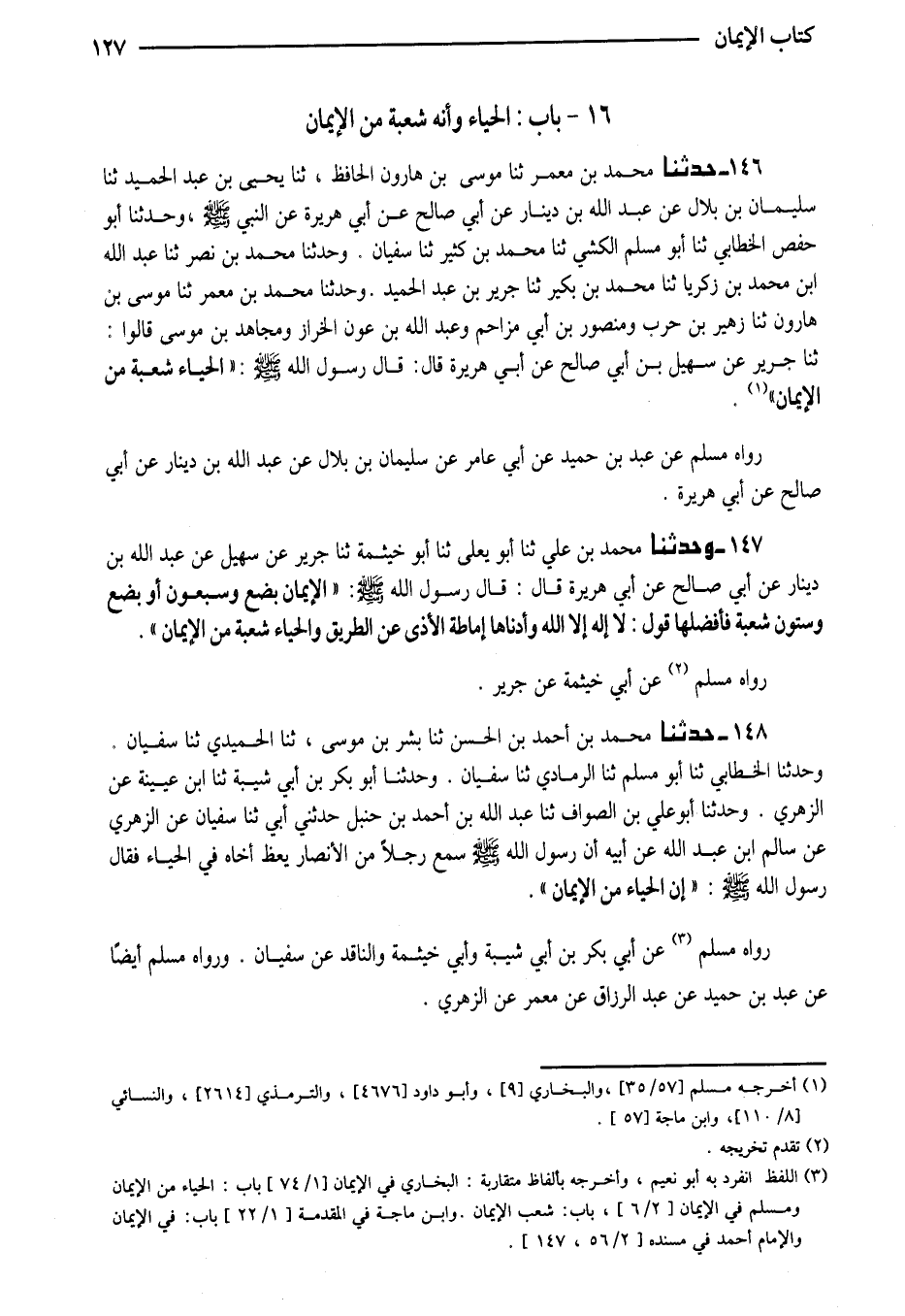 146 - حَدَّثَنَا مُحَمَّدُ بْنُ مَعْمَرٍ ثَنَا مُوسَى بْنُ هَارُونَ الْحَافِظُ ثَنَا يَحْيَى بْنُ عَبْدِ الْحَمِيدِ ثَنَا سُلَيْمَانُ بْنُ بِلالٍ عَنْ عَبْدِ اللَّهِ بْنِ دِينَارٍ عَنْ أَبِي صَالِحٍ عَنْ أَبِي هُرَيْرَةَ عَنِ النَّبِيِّ صَلَّى اللَّهُ عَلَيْهِ وَسَلَّمَ وَحَدَّثَنَا أَبُو حَفْصٍ الْخَطَّابِيُّ ثَنَا أَبُو مُسْلِمٍ الْكَشِّيُّ ثَنَا مُحَمَّدُ بْنُ كَثِيرٍ ثَنَا سُفْيَانُ وَحَدَّثَنَا مُحَمَّدُ بْنُ نَصْرٍ ثَنَا عبد الله ابْن مُحَمَّدِ بْنِ زَكَرِيَّا ثَنَا مُحَمَّدُ بْنُ بُكَيْرٍ ثَنَا جَرِيرُ بْنُ عَبْدِ الْحَمِيدِ وَحَدَّثَنَا مُحَمَّدُ بْنُ مَعْمَرٍ ثَنَا مُوسَى بُنْ هَارُونَ ثَنَا زُهَيْرُ بْنُ حَرْبٍ وَمَنْصُورُ بْنُ أَبِي مُزَاحِمٍ وَعَبْدُ اللَّهِ بْنُ عَوْنٍ الْخَرَّازُ وَمُجَاهِدُ بْنُ مُوسَى قَالُوا ثَنَا جرير بن سُهَيْلِ بْنِ أَبِي صَالِحٍ عَنْ أَبِي هُرَيْرَةَ قَالَ قَالَ رَسُولُ اللَّهِ صَلَّى اللَّهُ عَلَيْهِ وَسَلَّمَ (الْحَيَاءُ شُعْبَةٌ مِنَ الإِيمَانِ)