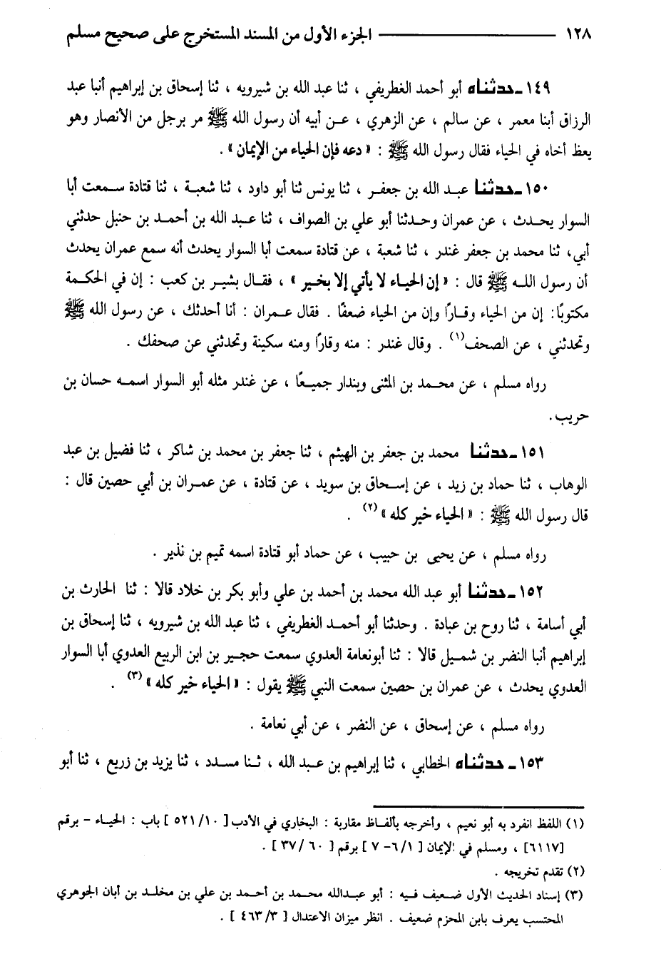 149 - حَدَّثَنَاهُ أَبُو أَحْمَدَ الْغِطْرِيفِيُّ ثَنَا عَبْدُ اللَّهِ بْنُ شِيرَوَيْهِ ثَنَا إِسْحَاقُ بْنُ إِبْرَاهِيمَ أَنْبَأَ عَبْدُ الرَّزَّاق أنبا معمر عَن سَالم عَن الزُّهْرِيّ عَنْ أَبِيهِ أَنَّ رَسُولَ اللَّهِ صَلَّى اللَّهُ عَلَيْهِ وَسَلَّمَ مَرَّ بِرَجُلٍ مِنَ الأَنْصَارِ وَهُوَ يَعِظُ أَخَاهُ فِي الْحَيَاءِ فَقَالَ رَسُولُ اللَّهِ صَلَّى اللَّهُ عَلَيْهِ وَسَلَّمَ (دَعْهُ فَإِنَّ الْحَيَاءَ مِنَ الإِيمَانِ)