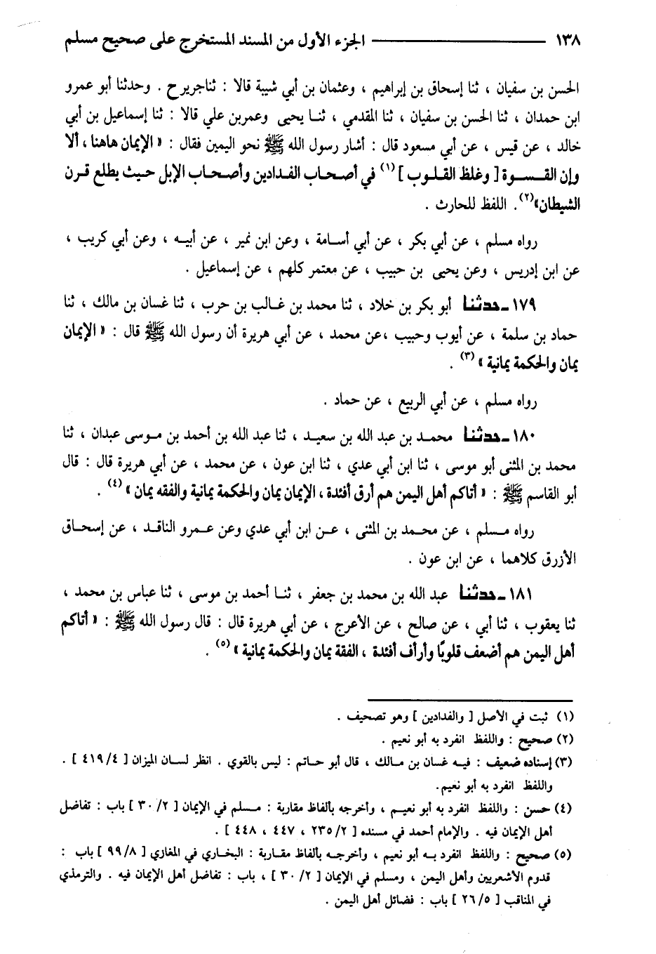الْحَسَنُ بْنُ سُفْيَانَ ثَنَا إِسْحَاقُ بن إِبْرَاهِيم وَعُثْمَان بْنِ أَبِي شَيْبَةَ قَالا ثَنَا جَرِيرٌ ح وَحَدَّثَنَا أَبُو عَمْرِو ابْنُ حَمْدَانَ ثَنَا الْحَسَنُ بْنُ سُفْيَانَ ثَنَا الْمُقَدِّمِيُّ ثَنَا يَحْيَى وَعَمْرُو بْنُ عَلِيٍّ قَالا ثَنَا إِسْمَاعِيلُ بْنُ أَبِي خَالِدٍ عَنْ قَيْسٍ عَنْ أَبِي مَسْعُودٍ قَالَ أَشَارَ رَسُولُ اللَّهِ صَلَّى اللَّهُ عَلَيْهِ وَسَلَّمَ نَحْوَ الْيَمِينِ فَقَالَ (الإِيمَانُ هَا هُنَا أَلا وَإِنَّ الْقَسْوَة وَغلظ الْقُلُوب صَحِيح فِي أَصْحَابِ الْفَدَّادِينَ وَأَصْحَابِ الإِبِلِ حَيْثُ يَطْلَعُ قَرْنُ الشَّيْطَانِ) اللَّفْظُ لِلْحَارِثِ صَحِيحٌ
