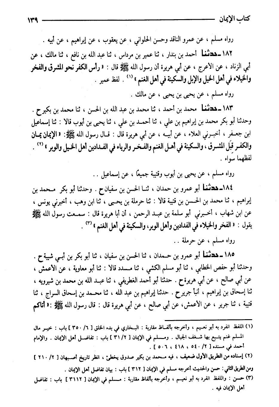 184 - حَدَّثَنَا أَبُو عَمْرِو بْنُ حَمْدَانَ ثَنَا الْحَسَنُ بْنُ سُفْيَانَ ح وَحَدَّثَنَا أَبُو بَكْر مُحَمَّدُ بْنُ إِبْرَاهِيمَ ثَنَا مُحَمَّدُ بْنُ الْحَسَنِ بْنِ قُتَيْبَةَ قَالا ثَنَا حَرْمَلَةُ بْنُ يَحْيَى ثَنَا ابْنُ وَهْبٍ أَخْبَرَنِي يُونُسُ عَنِ ابْنِ شِهَابٍ أَخْبَرَنِي أَبُو سَلَمَةَ بْنُ عَبْدِ الرَّحْمَنِ أَنَّ أَبَا هُرَيْرَةَ قَالَ سَمِعْتُ رَسُولَ اللَّهِ صَلَّى اللَّهُ عَلَيْهِ وَسَلَّمَ يَقُولُ (الْفَخْرُ وَالْخَيْلاءُ فِي الْفَدَّادِينَ وَأَهْلِ الْوَبَرِ وَالسَّكِينَةُ فِي أهل الْغنم) حسن