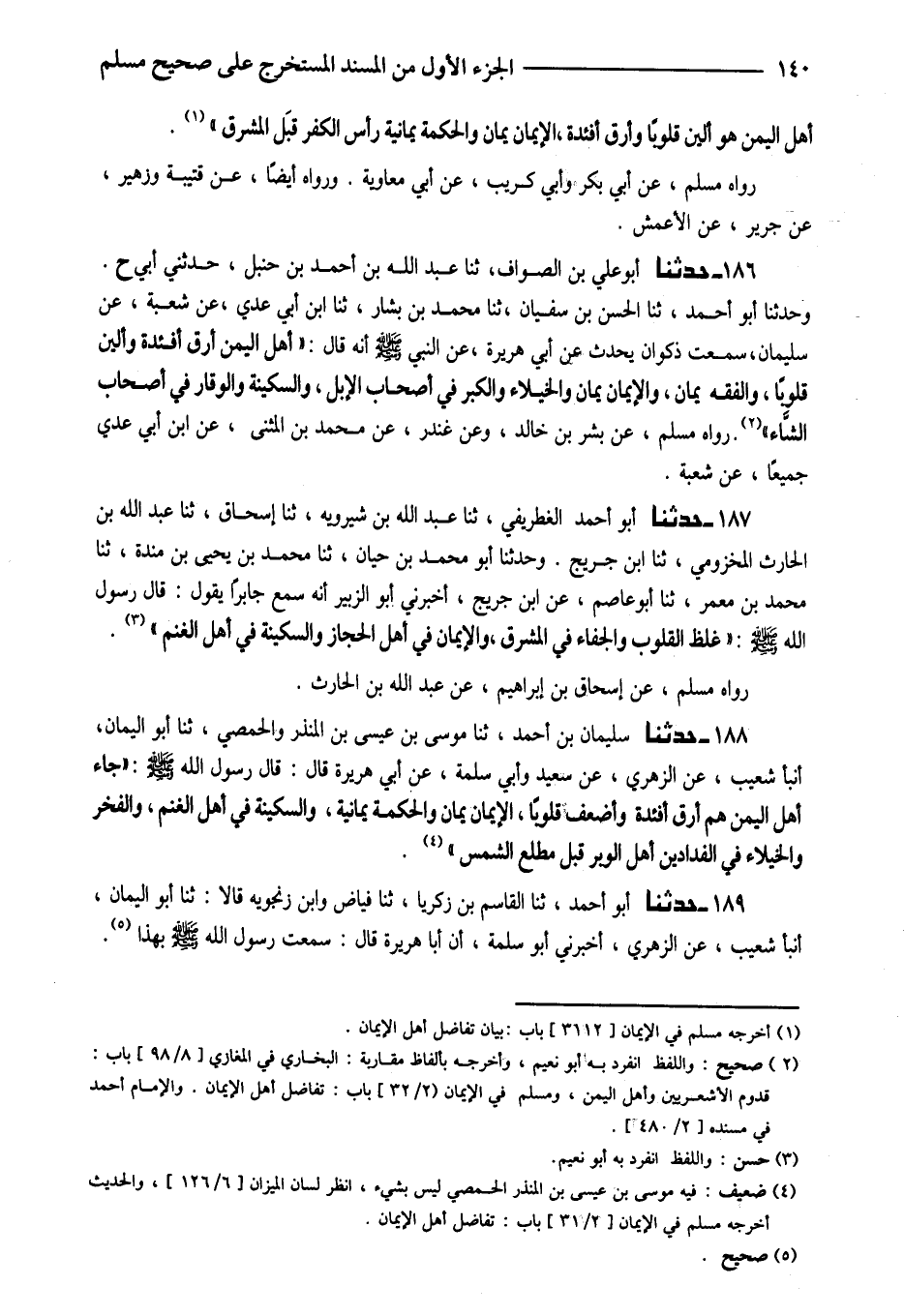 186 - حَدَّثَنَا أَبُو عَلِيِّ بْنُ الصَّوَّافِ ثَنَا عَبْدُ اللَّهِ بْنُ أَحْمَدَ بْنِ حَنْبَلٍ حَدَّثَنِي أَبِي ح وَحَدَّثَنَا أَبُو أَحْمَدَ ثَنَا الْحَسَنُ بْنُ سُفْيَانَ ثَنَا مُحَمَّدُ بْنُ بَشَّارٍ ثَنَا ابْنُ أَبِي عَدِيٍّ عَنْ شُعْبَةَ عَنْ سُلَيْمَانَ سَمِعْتُ ذَكْوَانَ يُحَدِّثُ عَنْ أَبِي هُرَيْرَةَ عَنِ النَّبِيِّ صَلَّى اللَّهُ عَلَيْهِ وَسَلَّمَ أَنَّهُ قَالَ (أَهْلُ الْيَمَنِ أَرَقُّ أَفْئِدَةً وَأَلْيَنُ قُلُوبًا وَالْفِقْهُ يَمَانٍ وَالإِيمَانُ يَمَانٍ وَالْخَيْلاءُ وَالْكِبْرُ فِي أَصْحَابِ الإِبِلِ وَالسَّكِينَةُ وَالْوَقَارُ فِي أَصْحَابِ الشَّاءِ) رَوَاهُ مُسْلِمٌ عَنْ بِشْرِ بْنِ خَالِدٍ وَعَنْ غُنْدَرٍ عَنْ مُحَمَّدِ بْنِ الْمُثَنَّى عَنِ ابْنِ أَبِي عَدِيٍّ جَمِيعًا عَنْ شُعْبَة صَحِيح