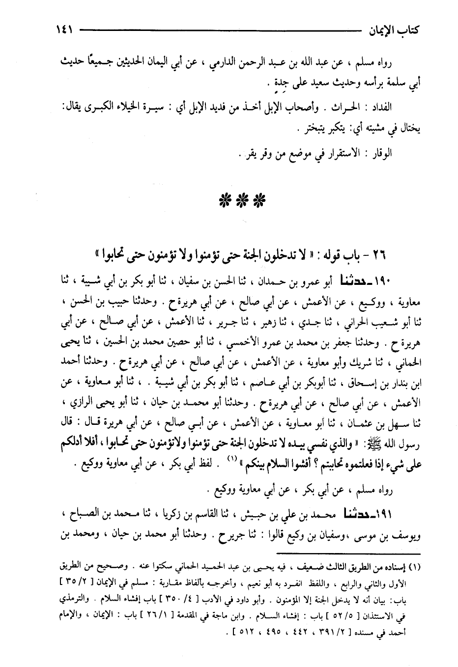 190 - حَدَّثَنَا أَبُو عَمْرِو بْنُ حَمْدَانَ ثَنَا الْحَسَنُ بْنُ سُفْيَانَ ثَنَا أَبُو بَكْرِ بْنُ أَبِي شَيْبَةَ ثَنَا مُعَاوِيَةُ وَوَكِيعٌ عَنِ الأَعْمَشِ عَنْ أَبِي صَالِحٍ عَنْ أَبِي هُرَيْرَةَ ح وَحَدَّثَنَا حَبِيبُ بْنُ الْحَسَنِ ثَنَا أَبُو شُعَيْبٍ الْحَرَّانِيُّ ثَنَا جَدِّي ثَنَا زُهَيْرٌ ثَنَا جَرِيرٌ ثَنَا الأَعْمَشُ عَنْ أَبِي صَالِحٍ عَنْ أَبِي هُرَيْرَةَ ح وَحَدَّثَنَا جَعْفَرُ بْنُ مُحَمَّدِ بْنِ عَمْرٍو الأَخْمَسِيُّ ثَنَا أَبُو حُصَيْنٍ مُحَمَّدُ بْنُ الْحُسَيْنِ ثَنَا يَحْيَى الْحِمَّانِيُّ ثَنَا شَرِيكٌ وَأَبُو مُعَاوِيَةَ عَنِ الأَعْمَشِ عَنْ أَبِي صَالِحٍ عَنْ أَبِي هُرَيْرَةَ ح وَحَدَّثَنَا أَحْمَدُ ابْن بُنْدَارِ بْنِ إِسْحَاقَ ثَنَا أَبُو بَكْرِ بْنُ أَبِي عَاصِمٍ ثَنَا أَبُو بَكْرِ بْنُ أَبِي شَيْبَةَ ثَنَا أَبُو مُعَاوِيَةَ عَنِ الأَعْمَشِ عَنْ أَبِي صَالِحٍ عَنْ أَبِي هُرَيْرَةَ ح وَحَدَّثَنَا أَبُو مُحَمَّدِ بْنُ حَيَّانَ ثَنَا أَبُو يَحْيَى الرَّازِيُّ ثَنَا سَهْلُ بْنُ عُثْمَانَ ثَنَا أَبُو مُعَاوِيَةَ عَنِ الأَعْمَشِ عَنْ أَبِي صَالِحٍ عَنْ أَبِي هُرَيْرَةَ قَالَ قَالَ رَسُولُ اللَّهِ صَلَّى اللَّهُ عَلَيْهِ وَسَلَّمَ (وَالَّذِي نَفْسِي بِيَدِهِ لَا تَدْخُلُونَ الْجَنَّةَ حَتَّى تُؤْمِنُوا وَلا تُؤْمِنُونَ حَتَّى تَحَابُّوا أَفَلا أَدُلُّكُمْ عَلَى شَيْءٍ إِذَا فَعَلْتُمُوهُ تَحَابَبْتُمْ أَفْشُوا السَّلامَ بَيْنكُم) إِسْنَاده من الطَّرِيق الثَّالِث ضَعِيف لَفْظُ أَبِي بَكْرٍ عَنْ أَبِي مُعَاوِيَةَ وَوَكِيعٍ رَوَاهُ مُسْلِمٌ عَنْ أَبِي بَكْرٍ عَنْ أَبِي مُعَاوِيَةَ وَوَكِيعٍ