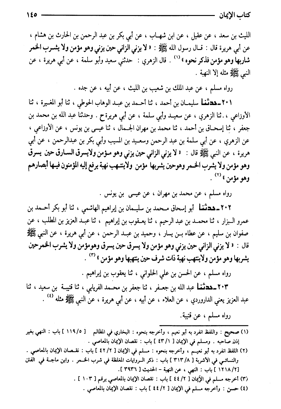 201 - حَدَّثَنَا سُلَيْمَانُ بن أَحْمَدُ بْنُ عَبْدِ الْوَهَّابِ الْحَوْطِيُّ ثَنَا أَبُو الْمُغِيرَةِ ثَنَا الأَوْزَاعِيُّ ثَنَا الزُّهْرِيُّ عَنْ سَعِيدٍ وَأَبِي سَلَمَةَ عَنْ أَبِي هُرَيْرَةَ ح وَحَدَّثَنَا عَبْدُ اللَّهِ بْنُ مُحَمَّدٍ بْنِ جَعْفَرٍ ثَنَا إِسْحَاقُ بْنُ أَحْمَدَ ثَنَا مُحَمَّدُ بْنُ مِهْرَانَ الْجَمَّالُ ثَنَا عِيسَى بْنُ يُونُسَ عَنِ الأَوْزَاعِيِّ عَنِ الزُّهْرِيِّ عَنْ أَبِي سَلَمَةَ بْنِ عَبْدِ الرَّحْمَنِ وَسَعِيدِ بْنِ الْمُسَيِّبِ وَأَبِي بَكْرِ بْنِ عَبْدِ الرَّحْمَنِ عَنْ أَبِي هُرَيْرَةَ عَنِ النَّبِيِّ صَلَّى اللَّهُ عَلَيْهِ وَسَلَّمَ قَالَ (لَا يَزْنِي الزَّانِي حِينَ يَزْنِي وَهُوَ مُؤْمِنٌ وَلا يَسْرِقُ السَّارِقُ حِينَ يَسْرِقُ وَهُوَ مُؤْمِنٌ وَلا يَشْرَبُ الْخَمْرَ وَهُوَ حِينَ يَشْرَبُهَا مُؤْمِنٌ وَلا يَنْتَهِبُ نُهْبَةً يَرْفَعُ إِلَيْهِ الْمُؤْمِنُونَ فِيهَا أَبْصَارَهُمْ وَهُوَ مُؤْمِنٌ)