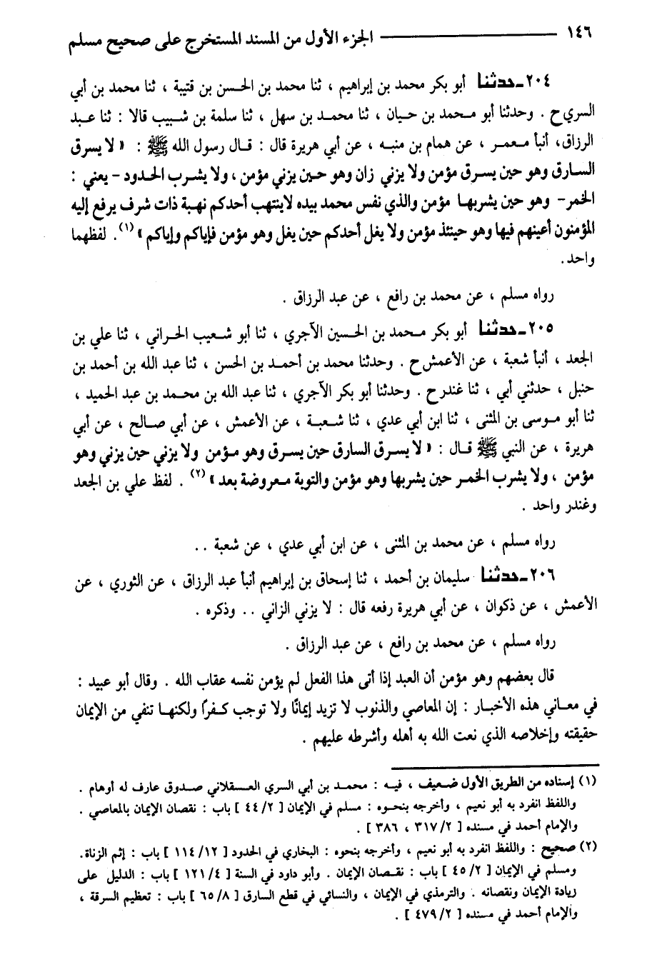 204 - حَدَّثَنَا أَبُو بَكْرٍ مُحَمَّدُ بْنُ إِبْرَاهِيمَ ثَنَا مُحَمَّدُ بْنُ الْحَسَنِ بْنِ قُتَيْبَةَ ثَنَا مُحَمَّدُ بْنُ أَبِي السَّرِيِّ ح وَحَدَّثَنَا أَبُو مُحَمَّدِ بْنُ حَيَّانَ ثَنَا مُحَمَّدُ بْنُ سَهْلٍ ثَنَا سَلَمَةُ بْنُ شَبِيبٍ قَالا ثَنَا عَبْدُ الرَّزَّاقِ أَنْبَأَ مَعْمَرٌ عَنْ هَمَّامِ بْنِ مُنَبِّهٍ عَنْ أَبِي هُرَيْرَةَ قَالَ قَالَ رَسُولُ اللَّهِ صَلَّى اللَّهُ عَلَيْهِ وَسَلَّمَ (لَا يَسْرِقُ السَّارِقُ وَهُوَ حِينَ يَسْرِقُ مُؤْمِنٌ وَلا يَزْنِي زَانٍ وَهُوَ حِينَ يَزْنِي مُؤْمِنٌ وَلا يَشْرَبُ الْحُدُودَ يَعْنِي الْخَمْرَ وَهُوَ حِينَ يَشْرَبُهَا مُؤْمِنٌ وَالَّذِي نَفْسُ مُحَمَّدٍ بِيَدِهِ لَا يَنْتَهِبُ أَحَدُكُمْ نُهْبَةً ذَاتَ شَرَفٍ يَرْفَعُ إِلَيْهِ الْمُؤْمِنُونَ أَعْيُنَهُمْ فِيهَا وَهُوَ حِينَئِذٍ مُؤْمِنٌ وَلا يَغُلُّ أَحَدُكُمْ حِينَ يَغُلُّ وَهُوَ مُؤْمِنٌ فإياكم وَإِيَّاكُم) لَفْظهمَا وَاحِد ضَعِيفٌ