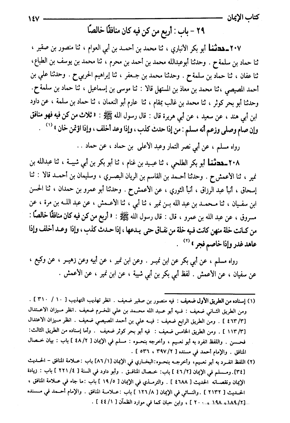 207 - حَدَّثَنَا أَبُو بَكْرٍ الأَنْبَارِيُّ ثَنَا مُحَمَّدُ بْنُ أَحْمَدَ بْنِ أَبِي الْعَوَّامِ ثَنَا مَنْصُورُ بْنُ صُقَيْرٍ ثَنَا حَمَّادُ بْنُ سَلَمَةَ ح وَحَدَّثَنَا أَبُو عَبْدِ اللَّهِ مُحَمَّدُ بْنُ أَحْمَدَ بْنِ مُحَرَّمٍ ثَنَا مُحَمَّدُ بْنُ يُوسُفَ بْنِ الطَّبَّاعِ ثَنَا عَفَّانُ ثَنَا حَمَّادُ بْنُ سَلَمَةَ ح وَحَدَّثَنَا مُحَمَّدُ بْنُ جَعْفَرٍ ثَنَا إِبْرَاهِيمُ الْحَرْبِيُّ ح وَحَدَّثَنَا عَلِيُّ بْنُ أَحْمَدَ الْمِصِّيصِيُّ ثَنَا مُحَمَّدُ بْنُ مُعَاذِ بْنِ الْمُسْتَهِلِّ قَالا ثَنَا مُوسَى بْنُ إِسْمَاعِيلَ ثَنَا حَمَّادُ بْنُ سَلَمَةَ ح وَحَدَّثَنَا أَبُو بَحْرٍ كَوْثَرٌ ثَنَا مُحَمَّدُ بْنُ غَالِبٍ بِمُقَامٍ ثَنَا عَارِمٌ أَبُو النُّعْمَانِ ثَنَا حَمَّادُ بْنُ سَلمَة عَن دَاوُد ابْن أَبِي هِنْدٍ عَنْ سَعِيدٍ عَنْ أَبِي هُرَيْرَةَ قَالَ قَالَ رَسُولُ اللَّهِ صَلَّى اللَّهُ عَلَيْهِ وَسَلَّمَ (ثَلاثٌ مَنْ كُنَّ فِيهِ فَهُوَ مُنَافِقٌ وَإِنْ صَامَ وَصَلَّى وَزَعَمَ أَنَّهُ مُسْلِمٌ مَنْ إِذَا حَدَّثَ كَذَبَ وَإِذَا وَعَدَ أَخْلَفَ وَإِذَا اؤتمن خَان) ضَعِيف