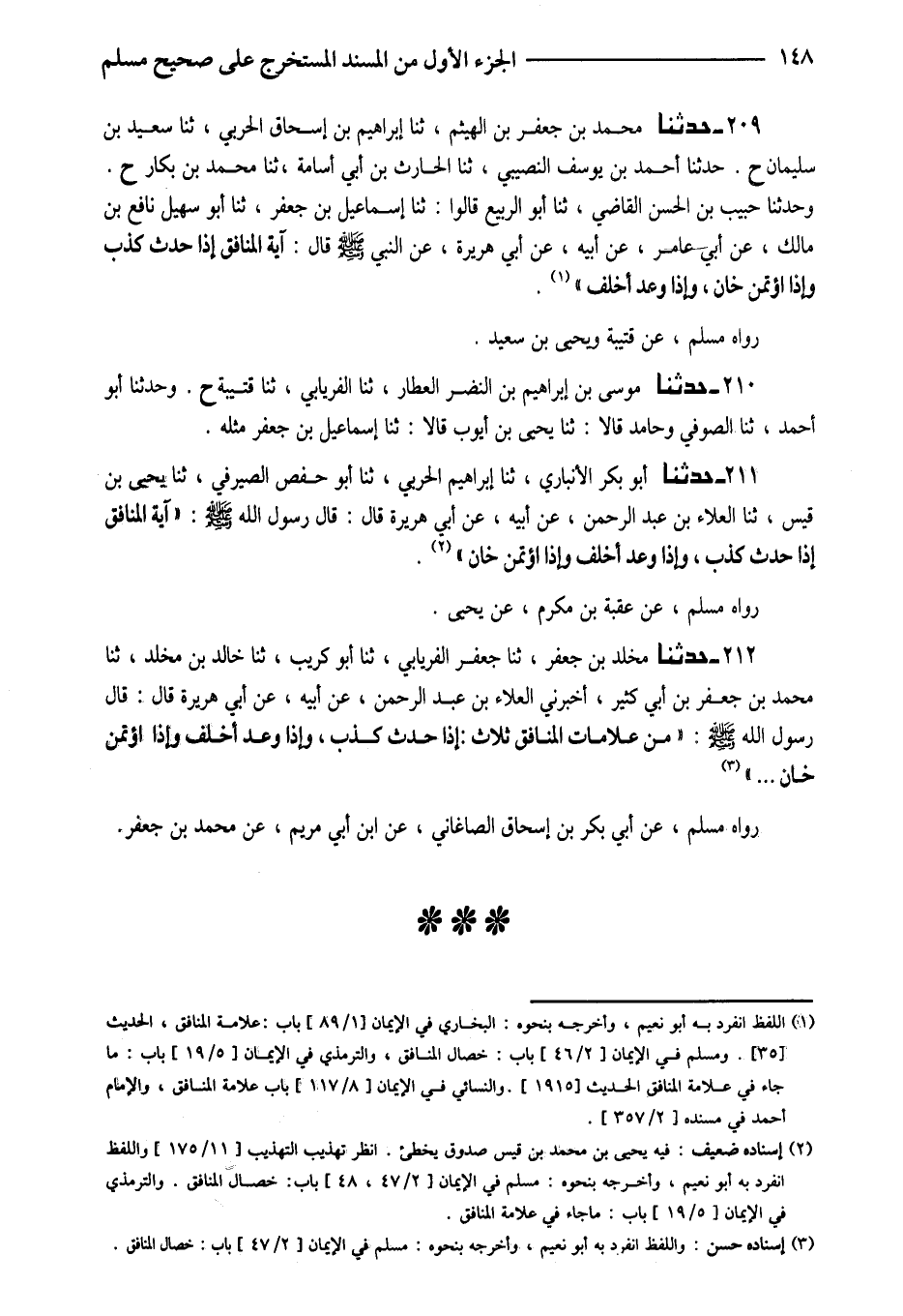 209 - حَدَّثَنَا مُحَمَّدُ بْنُ جَعْفَرِ بْنِ الْهَيْثَمِ ثَنَا إِبْرَاهِيمُ بْنُ إِسْحَاقَ الْحَرْبِيُّ ثَنَا سَعِيدُ بْنُ سُلَيْمَانَ ح حَدَّثَنَا أَحْمَدُ بْنُ يُوسُفَ النَّصِيبِيُّ ثَنَا الْحَارِثُ بْنُ أَبِي أُسَامَةَ ثَنَا مُحَمَّدُ بْنُ بَكَّارٍ ح وَحَدَّثَنَا حَبِيبُ بْنُ الْحَسَنِ الْقَاضِي ثَنَا أَبُو الرَّبِيعِ قَالُوا ثَنَا إِسْمَاعِيلُ بْنُ جَعْفَرٍ ثَنَا أَبُو سُهَيْلٍ نَافِعُ بْنُ مَالِكِ عَن أَبِي عَامِرٍ عَنْ أَبِيهِ عَنْ أَبِي هُرَيْرَةَ عَنِ النَّبِيِّ صَلَّى اللَّهُ عَلَيْهِ وَسَلَّمَ قَالَ (آيَةُ الْمُنَافِقِ إِذَا حَدَّثَ كَذَبَ وَإِذَا اؤْتُمِنَ خَانَ وَإِذَا وَعَدَ أَخْلَفَ)