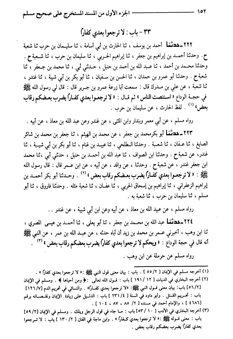 223 - حَدَّثَنَا أَبُو بكر مُحَمَّدِ بْنِ جَعْفَرٍ عَنْ مُحَمَّدِ بن الْهَيْثَم ثَنَا جَعْفَر بن مُحَمَّدِ بْنِ شَاكِرٍ الصَّايِغُ ثَنَا عَفَّانُ ثَنَا شُعْبَةُ وَحَدَّثَنَا الطَّلْحِيُّ ثَنَا عُبَيْدُ بْنُ غَنَّامٍ ثَنَا أَبُو بَكْرِ بْنُ أَبِي شَيْبَةَ ثَنَا غُنْدَرٌ عَنْ شُعْبَةَ ح وَحَدَّثَنَا ابْنُ الصَّوَّافِ ثَنَا عَبْدُ اللَّهِ بْنُ أَحْمَدَ بْنِ حَنْبَلٍ حَدَّثَنى ابي ثَنَا مُحَمَّد ابْن جَعْفَرٍ غُنْدَرٌ عَنْ شُعْبَةَ ح وَحَدَّثَنَا عَنْ وَاقِدٍ عَنْ أَبِيهِ عَنِ ابْنِ عُمَرَ قَالَ قَالَ رَسُولُ اللَّهِ صَلَّى اللَّهُ عَلَيْهِ وَسَلَّمَ (لَا تَرْجِعُوا بَعْدِي كُفَّارًا يَضْرِبُ بَعْضُكُمْ رِقَابَ بَعْضٍ) وَحَدَّثَنَا أَبُو بَكْرٍ أَحْمَدُ بْنُ إِبْرَاهِيمَ الزَّعْفَرَانِيُّ ثَنَا إِبْرَاهِيمُ بْنُ إِسْحَاقَ الْحَرْبِيُّ ثَنَا عَفَّانُ ثَنَا شُعْبَةُ مِثْلَهُ وَحَدَّثَنَا فَارُوقٌ ثَنَا أَبُو مُسْلِمٍ ثَنَا سُلَيْمَانُ بْنُ حَرْبٍ ثَنَا شُعْبَةُ بِهِ