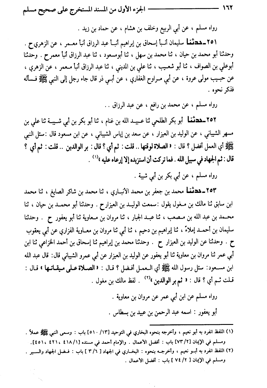 253 - حَدَّثَنَا مُحَمَّدُ بْنُ جَعْفَرِ بْنِ مُحَمَّدٍ الأَنْبَارِيُّ ثَنَا مُحَمَّدُ بْنُ شَاكر الصايغ ثَنَا مُحَمَّد ابْن سَابِقٍ ثَنَا مَالِكُ بْنُ مِغْوَلٍ يَقُولُ سَمِعْتُ الْوَلِيدَ بْنَ الْعِيزَارِ ح وَحَدَّثَنَا أَبُو مُحَمَّدِ بْنُ حَيَّانَ ثَنَا مُحَمَّدُ بْنُ عَبْدِ اللَّهِ بْنِ مُصْعَبٍ ثَنَا عَبْدُ الْجَبَّارِ ثَنَا مَرْوَانُ بْنُ مُعَاوِيَةَ ثَنَا أَبُو يَعْفُورٍ ح وَحَدَّثَنَا سُلَيْمَانُ بْنُ أَحْمَدَ إِمْلاءً ثَنَا إِبْرَاهِيمُ بْنُ دُحَيْمٍ ثَنَا أَبِي ثَنَا مَرْوَانُ بْنُ مُعَاوِيَةَ الْفَزَارِيُّ عَنْ أَبِي يَعْقُوبَ ح وَحَدَّثَنَا عَنِ الْوَلِيدِ بْنِ الْعِيزَارِ ح وَحَدَّثَنَا مُحَمَّدُ بْنُ إِبْرَاهِيمَ ثَنَا إِسْحَاقُ بْنُ أَحْمَدَ الْخُزَاعِيُّ ثَنَا ابْنُ أَبِي عُمَرَ ثَنَا مَرْوَانُ بْنُ مُعَاوِيَةَ ثَنَا أَبُو يَعْفُورٍ عَنِ الْوَلِيدِ بْنِ الْعِيزَارِ عَنْ أَبِي عَمْرٍو الشَّيْبَانِيِّ قَالَ قَالَ عبد الله ابْن مَسْعُودٍ سُئِلَ رَسُولُ اللَّهِ صَلَّى اللَّهُ عَلَيْهِ وَسَلَّمَ أَيُّ الْعَمَلِ أَفْضَلُ قَالَ (الصَّلاةُ عَلَى مِيقَاتِهَا) قَالَ قُلْتُ ثُمَّ أَيٌّ قَالَ (ثُمَّ بِرُّ الْوَالِدَيْنِ) لَفْظُ مَالِكِ بْنِ مِغْوَلٍ