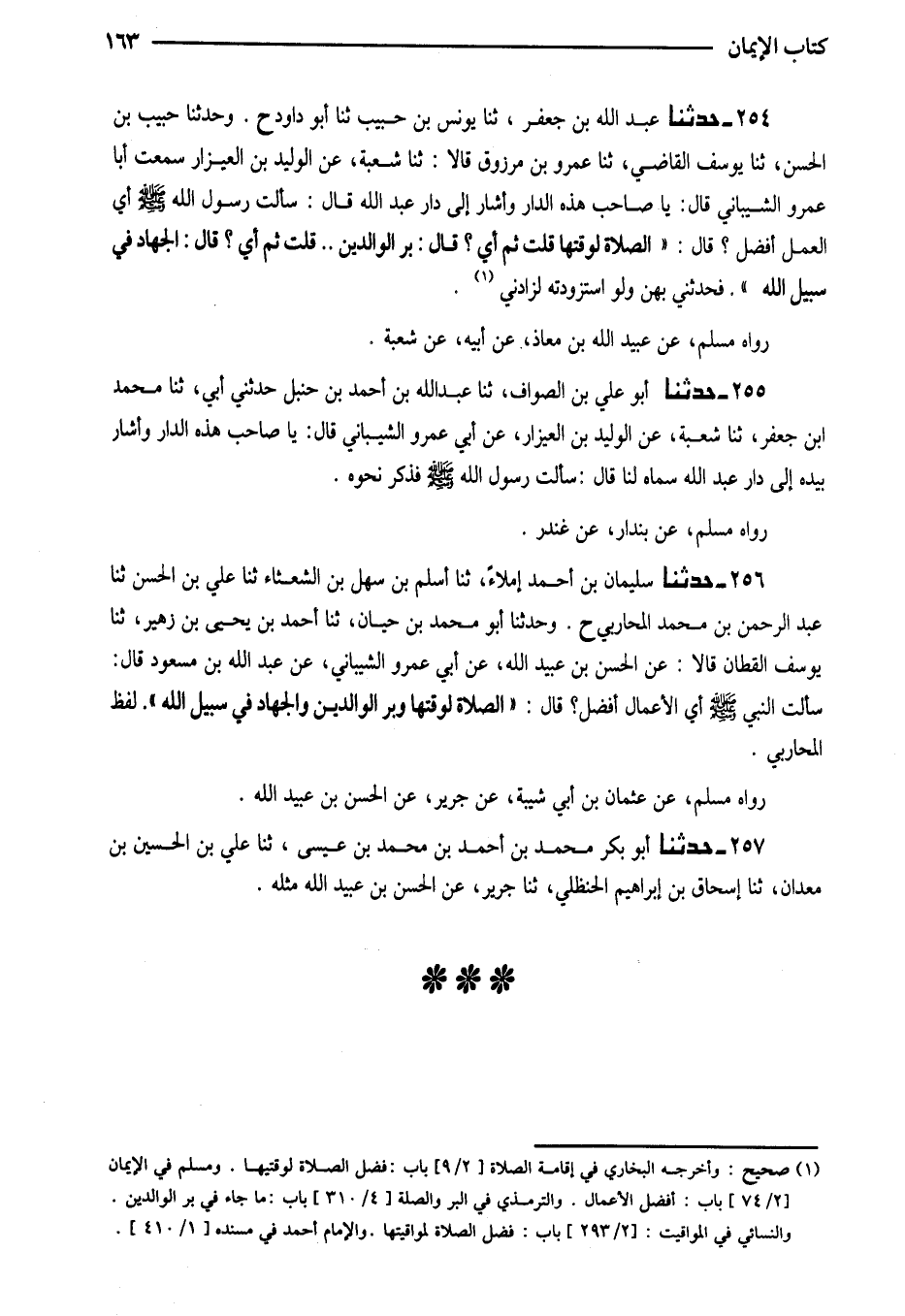 256 - حَدَّثَنَا سُلَيْمَانُ بْنُ أَحْمَدَ إِمْلاءً ثَنَا أسلم بن سهل بن الشعْثَاء ثَنَا عَلِيُّ بْنُ الْحَسَنِ ثَنَا عَبْدُ الرَّحْمَنِ بْنُ مُحَمَّدٍ الْمُحَارِبِيُّ ح وَحَدَّثَنَا أَبُو مُحَمَّدِ بْنُ حَيَّانَ ثَنَا أَحْمَدُ بْنُ يَحْيَى بْنِ زُهَيْرٍ ثَنَا يُوسُفُ الْقَطَّانُ قَالا عَنِ الْحَسَنِ بْنِ عُبَيْدِ اللَّهِ عَنْ أَبِي عَمْرٍو الشَّيْبَانِيِّ عَنْ عَبْدِ اللَّهِ بْنِ مَسْعُودٍ قَالَ سَأَلْتُ النَّبِيَّ صَلَّى اللَّهُ عَلَيْهِ وَسَلَّمَ أَيُّ الأَعْمَالِ أَفْضَلُ قَالَ (الصَّلاةُ لِوَقْتِهَا وَبِرُّ الْوَالِدَيْنِ وَالْجِهَادُ فِي سَبِيلِ اللَّهِ) لَفْظُ الْمُحَارِبِيِّ